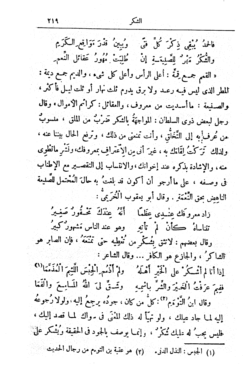 القمم جمع قِمّة: أعلى الرأس وأعلى كل شيء، والديم جمع ديمة: المطر الذي ليس فيه رعد ولا برق يدوم ثلث نهار أو ثلث ليل فأكثر، والصنيعة: ما أسديت من معروف، والعقائل: كرائم الأموال وقال رجل لبعض ذوي السلطان: المواجهةُ بالشكر ضَرْبٌ من المَلَقِ، منسوبٌ من عُرف به إلى التَّخَلُّقِ، وأنْتَ تمنعني من ذلك، وترفع الحال بيننا عنه، ولذلك تَرَكْتُ لِقاءَك به، غيرَ أنّي مِن الاعترافِ بِمَعْروفِك، ونَشْرِ ما تطوي منه، والإشادة بذكره عند إخوانك، والانتساب إلى التقصير مع الإطناب في وصفه، على ما أرجو أن أكون قد بلغتُ به حالَ المُحْتمل للصَّنيعة النّاهض بحقِّ النِّعْمَةِ. وقال أبو يعقوب الخُرَيميُّ: