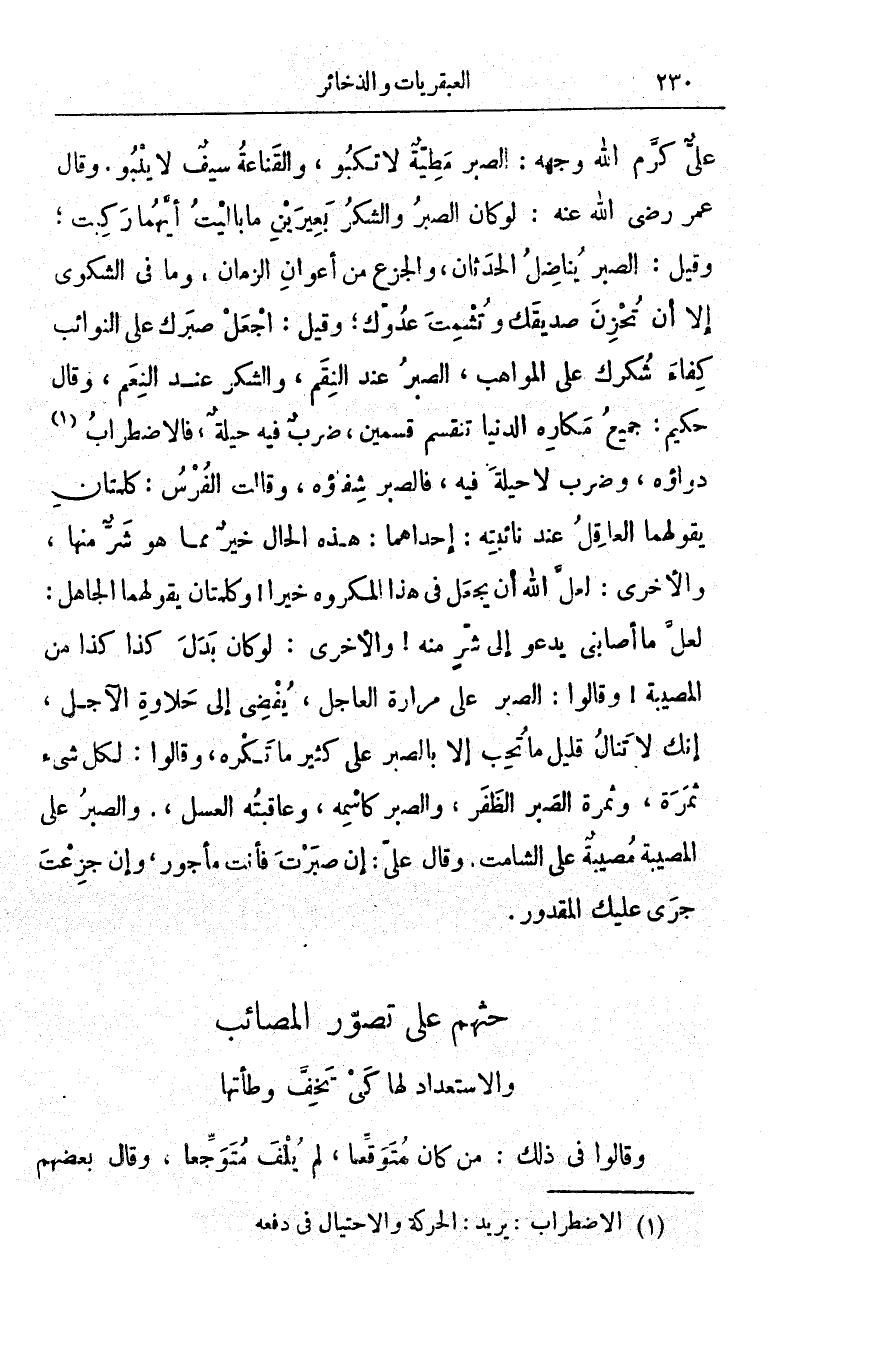والقناعةُ سيفٌ لا ينبو. وقال عمرُ رضي الله عنه: لو كان الصبرُ والشكرُ بعيرين ما باليتُ أيَّهما ركبت؛ وقيل: الصبرُ يُناضِلُ الحدَثان، والجزعُ من أعوانِ الزمان، وما في الشكوى إلا أن تُحْزِنَ صديقَك وتُشْمِتَ عدوَّك؛ وقيل: اجعل صبرَك على النّوائب كِفاءَ شُكْرك على المواهب، الصبرُ عندَ النِّقم، والشكر عند النِّعم، وقال حكيم: جميعُ مكاره الدُّنيا تنقسم قسمين، ضربٌ فيه حيلةٌ، فالاضطراب دواؤه، وضربٌ لا حيلةَ فيه، فالصبر شفاؤه، وقالت الفرس: كلمتان يقولُهما العاقلُ عند نائبته: إحداهما: هذه الحال خيرٌ ممّا هو شرٌّ منها، والأخرى: لعلَّ اللهَ أن يجعلَ في هذا المكروه خيراً! وكلمتان يقولُهما الجاهل: لعلّ ما أصابني يدعو إلى شَرٍّ منه! والأخرى: لو كان بَدلَ كذا كذا من المصيبة! وقالوا: الصبرُ على مرارةِ العاجل، يُفضي إلى حلاوةِ الآجل، إنّك لا تنال قليلَ ما تحبُّ إلا بالصبرِ على كثيرِ ما تَكْره، وقالوا: لكلِّ شيءٍ ثمرةٌ، وثمرةُ الصبر الظفرُ، والصبرُ كاسْمِه، وعاقبتُه العسل، والصبر على المصيبة مصيبةٌ على الشّامت. وقال عليٌّ: إن صبرتَ فأنتَ مأجورٌ، وإن جَزِعْتَ جرى عليك المَقْدور.