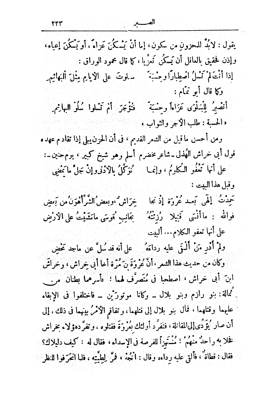 ومن أحسن ما قيل من الشعر القديم، في أنَّ الحزن يبلى إذا تقادم عهدُه قول أبي خراش الهُذلي - شاعر مخضرم أسلم وهو شيخٌ كبير، يوم حنين -: