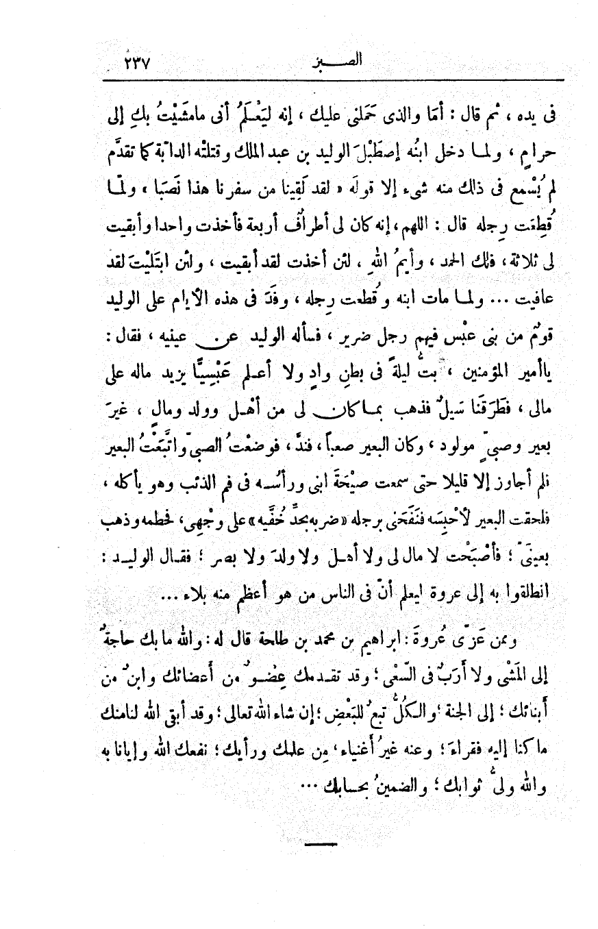 في يده، ثم قال: أما والذي حَملَني عليك، إنّه ليعلم أنّي ما مشيتُ بك إلى حرامٍ، ولمّا دخل ابنه إصطبلَ الوليد بن عبد الملك وقتلتْه الدَّابّة كما تقدَّم لَمْ يُسْمَعْ في ذلك منه شيءٌ إلا قوله {لَقَدْ لَقِينَا مِن سَفَرِنَا هَذَا نَصَباً} ولمّا قُطِعت رجلُه قال: اللهمَّ، إنّه كان لي أطرافٌ أربعةٌ فأخذت واحداً وأبقيت لي ثلاثةً، فلك الحمد، وأيْمُ اللهِ، لئن أخذْتَ لقد أبقيتَ، ولئن ابتليتَ لقد عافيتَ. . . ولمّا مات ابنُه وقطعت رجلُه، وفد في هذه الأيام على الوليد قومٌ من بني عبس فيهم رجلٌ ضرير، فسأله الوليد عن عينيه، فقال: يا أميرَ المؤمنين، بتُّ ليلةً في بطن وادٍ ولا أعلم عَبْسيّاً يزيدُ مالُه على مالي، فطرقنا سيلٌ فذهبَ بما كان لي من أهلٍ وولدٍ ومالٍ، غيرَ بعيرٍ وصبيٍّ مولود، وكان البعير صَعْباً، فنَدَّ، فوضعت الصبيَّ واتَّبعتُ البعيرَ فلم أجاوِزْ إلا قليلاً حتّى سمعتُ صيحةَ ابني ورأسُه في فَمِ الذئبِ وهو يأكلُه، فلَحِقْتُ البعيرَ لأحبسَه فنفَحني برجلِه ضربَه بحدِّ خُفّيه على وجهي، فحطَّمه وذهب بعينيّ؛ فأصبحتُ لا مالٌ لي ولا أهلٌ ولا ولدٌ ولا بصرٌ؛ فقال الوليد: انطلقوا به إلى عُروةَ ليعلمَ أنّ في الناسِ من هو أعظمُ منه بلاءً. . .