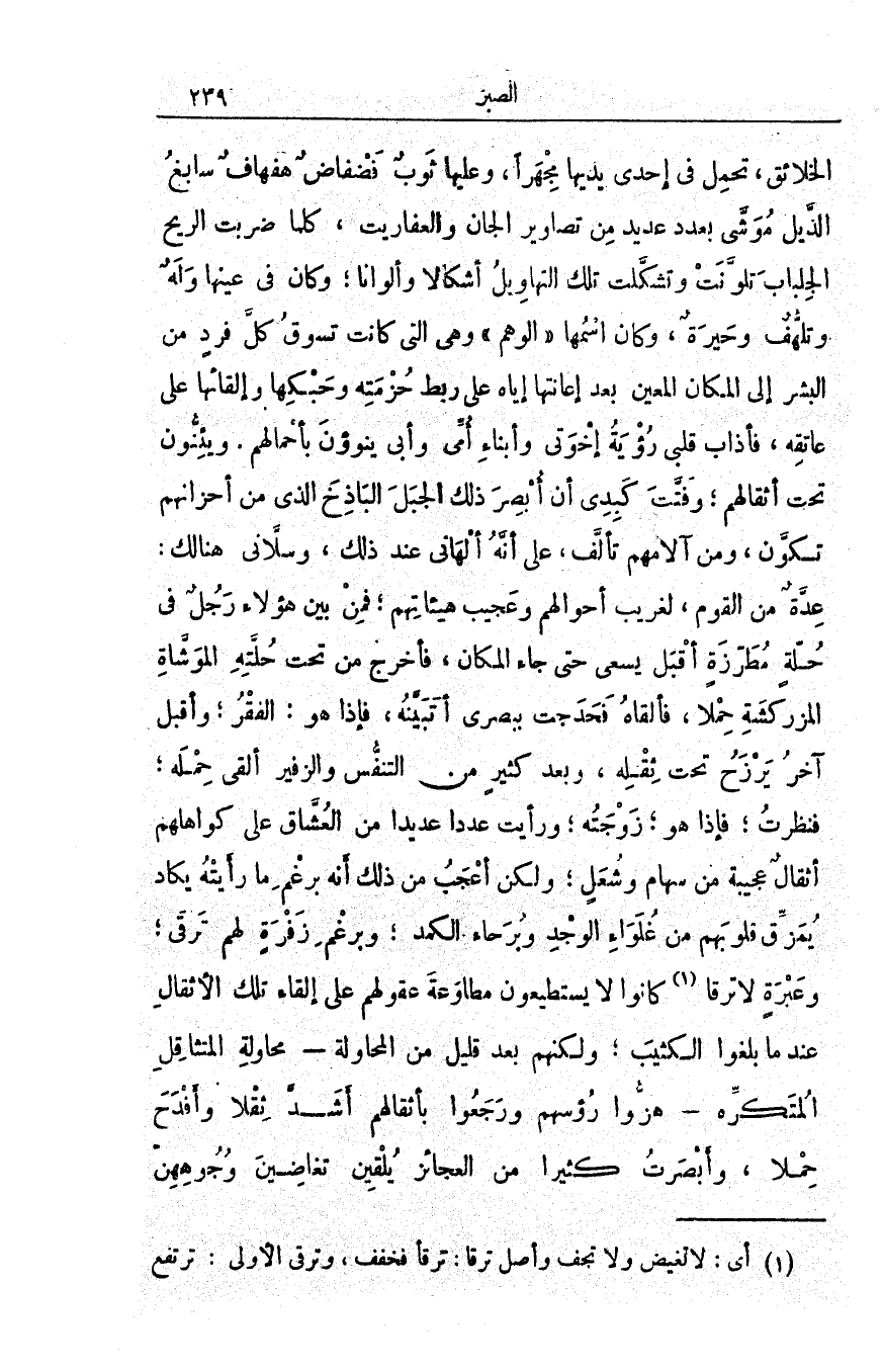 الخلائق، تحمل في إحدى يديها مِجهراً، وعليها ثوبٌ فضفاضٌ هَفْهافٌ سابغُ الذيل موشَّى بعدد عديد من تصاوير الجان والعفاريت، كلّما ضربت الريحُ الجلبابَ تلوّنت وتشكّلت تلك التهاويلُ أشكالاً وألواناً؛ وكان في عينها وَلَهٌ وتلهُّفٌ وحيرةٌ، وكان اسمها الوهم وهي التي كانت تسوق كلّ فردٍ من البشر إلى المكان المعيّن بعد إعانتِها إيّاه على ربط حُزمته وحَبْكِها وإلقائِها على عاتقه، فأذاب قلبي رؤيةُ إخوتي وأبناء أمي وأبي ينوؤون بأحمالهم. ويئنّون تحت أثقالهم؛ وفتّت كبدي أن أبصرَ ذلك الجبلَ الباذخَ الذي من أحزانهم تكوّن، ومن آلامهم تألّف، على أنه ألهاني عند ذلك، وسلاني هنالك: عدةٌ من القوم، لغريبِ أحوالهم وعجيبِ هيئاتهم؛ فمن بين هؤلاء رجلٌ في حُلّة مطرزةٍ أقبل يسعى حتى جاء المكان، فأخرج من تحت حلّته الموشّاة المُزركشة حملاً، فألقاه فحَدَجْتُ ببصري أتبيّنه، فإذا هو: الفقر؛ وأقبل آخرُ يرزح
