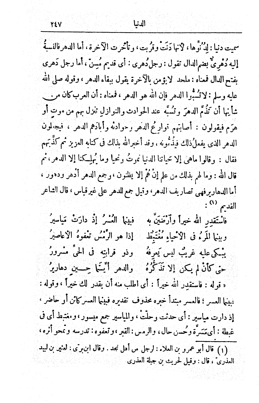 سُمِّيت دُنيا: لدنوِّها، لأنّها دنت وقرُبت، وتأخَّرت الآخرة، أما الدُّهر فالنسبةُ إليه دُهْرِيٌّ بضمِّ الدّال تقول: رجلٌ دُهْرِيٌّ: أي قديمٌ مسن، أما رجلٌ دَهْريٌّ بفتح الدّال فمعناه: مُلْحِدٌ لا يؤمن بالآخرة يقول ببقاء الدّهر، وقوله صلى الله عليه وسلم: (لا تسبّوا الدَّهْرَ فإنّ اللهَ هو الدّهر)، فمعناه: أنّ العربَ كان من شأنها أن تذمَّ الدهرَ وتسبَّه عند الحوادث والنوازلِ تنزل بهم من موتٍ أو هَرمٍ فيقولون: أصابتهم قوارِعُ الدَّهر وحوادثُه وأبادهم الدَّهرُ، فيجعلون