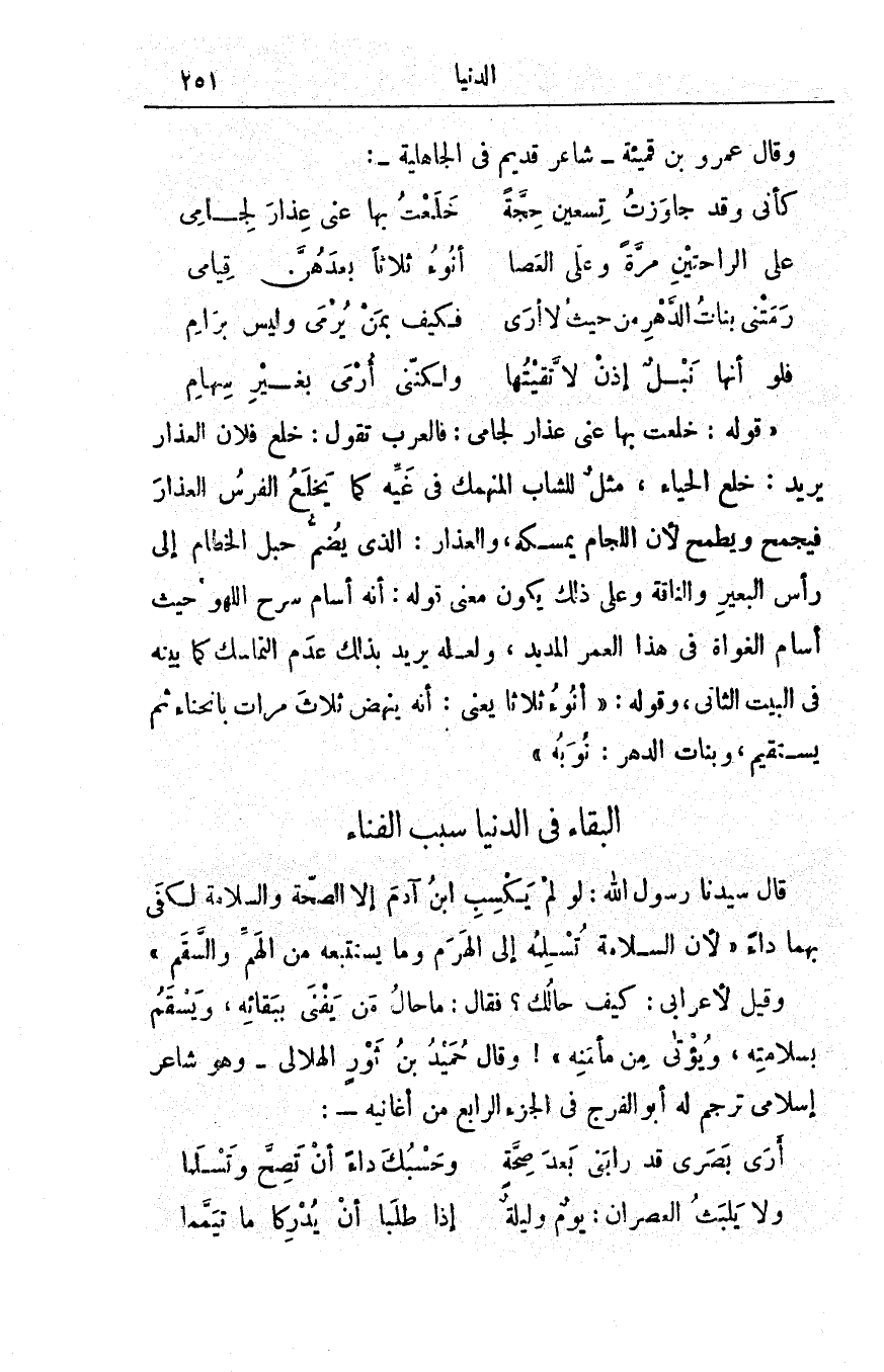 وقيل لأعرابي: كيف حالُك؟ فقال: ما حالُ مَنْ يَفْنى ببقائِه، ويَسْقمُ بسلامتِه، ويُؤْتى من مأمنِه! وقال حُمَيْدُ بن ثَوْرٍ الهلالي - وهو شاعرٌ إسلامي ترجم له أبو الفرج في الجزء الرابع من أغانيه -: