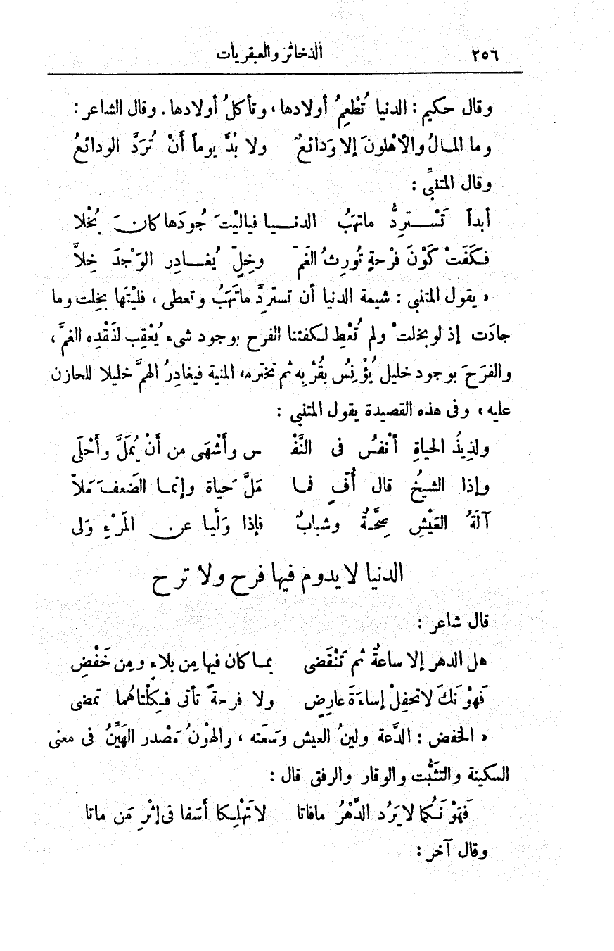وقال حكيم: الدُّنيا تُطعم أولادَها، وتأكل أولادَها. وقال الشاعر: