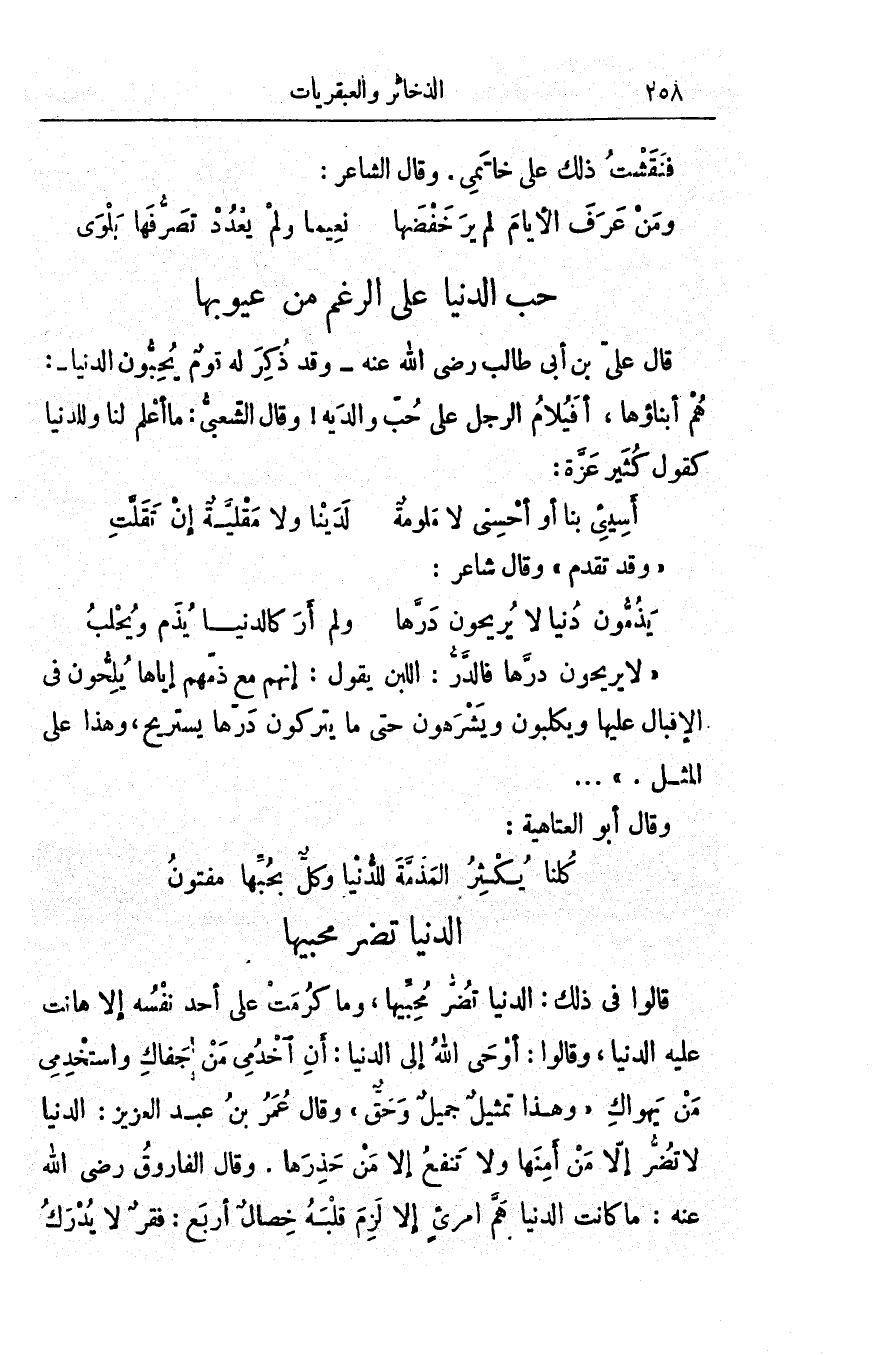 قال علي بن أبي طالب رضي الله عنه - وقد ذُكر له قومٌ يحبّون الدُّنيا -: هُمْ أبناؤها، أفَيُلامُ الرجلُ على حبِّ والِدَيْه! وقال الشَّعبيُّ: ما أعلمُ لنا وللدنيا كقولِ كثيّر عزّة:
