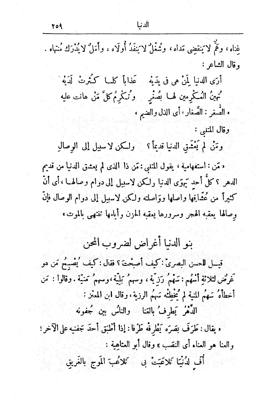 أرَى الدُّنيا لِمَنْ هيَ في يَدَيْهِ ... عَذاباً كلَّما كَثُرَتْ لَدَيْهِ