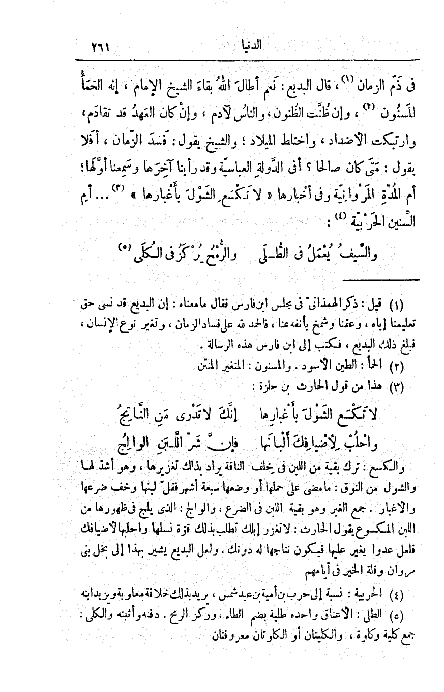 في ذمِّ الزمان، قال البديع: نَعَمْ أطالَ اللهُ بقاءَ الشيخِ الإمام، إنّه الحَمَأ المَسْنون، وإنْ ظُنَّت الظُّنون، والنَّاسُ لآدَمَ، وإنْ كان العهدُ قد تقادَمَ، وارتبكَتِ الأضدادُ،