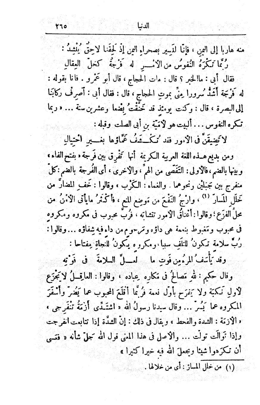 وقال حكيم: لله مصالحُ في مكارِه عبادِه، وقالوا: العاقلُ لا يجزعُ لأوَّلِ نكبةٍ ولا يفرحُ بأوَّلِ نعمةٍ فربّما أقلعَ المحبوبُ عمّا يَضُرُّ وأسفرَ المكروهُ عمّا يَسُرُّ. . . وقال سيّدُنا رسولُ الله (اشْتدّي أزمةُ تَنْفَرجي) الأزمة: الشِّدّةُ والقَحْط ويُقال في ذلك: إنَّ الشدَّةَ إذا تتابَعَتْ انفرجَتْ وإذا توالَتْ تولّت. . والأصلُ في هذا المعنى قولُ اللهِ جلَّ شأنُه {فَعَسَى أَن تَكْرَهُواْ شَيْئاً وَيَجْعَلَ اللهُ فِيهِ خَيْراً كَثِيراً}.