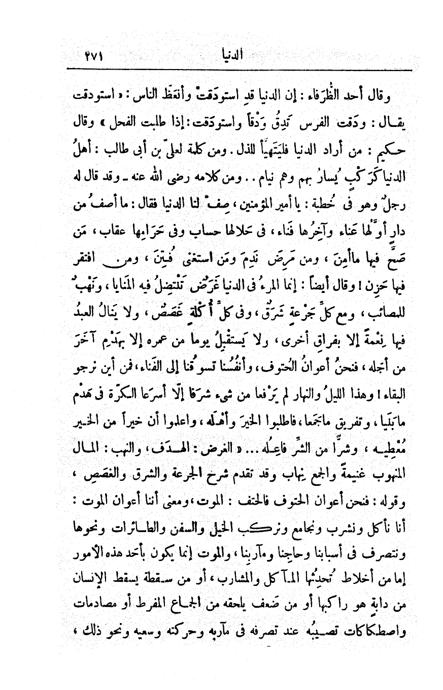 وقال أحدُ الظُّرفاء: إنَّ الدُّنيا قد اسْتَودَقَتْ وأنْعَظَ الناس: اسْتَوْدَقَتْ يقال: وَدَقَت الفرسُ تَدِقُ وَدْقاً واسْتَوْدَقَتْ: إذا طلَبَتِ الفَحْلَ وقال حكيم: مَنْ أرادَ الدُّنيا فلْيَتَهيَّأ للذلّ. ومن كلمةٍ لعليِّ بن أبي طالب: أهلُ الدُّنيا كَرَكْبٍ يُسارُ بِهِمْ وهم نِيام. ومن كلامِه رضِيَ اللهُ عنه - وقد قال له رجلٌ وهو في خُطبة: يا أميرَ المؤمنين، صِفْ لنا الدُّنيا فقال: ما أصِفُ من دارٍ أوَّلُها عَناءٌ وآخِرُها فناءٌ، في حَلالِها حسابٌ وفي حرامِها عِقابٌ، مَنْ صحَّ فيها ما أمِنَ، ومَنْ مَرِضَ نَدِمَ ومن اسْتَغْنى فُتِنَ، ومَنِ افتقرَ فيها حَزِنَ! وقال أيضاً: إنَّما المرءُ في الدنيا