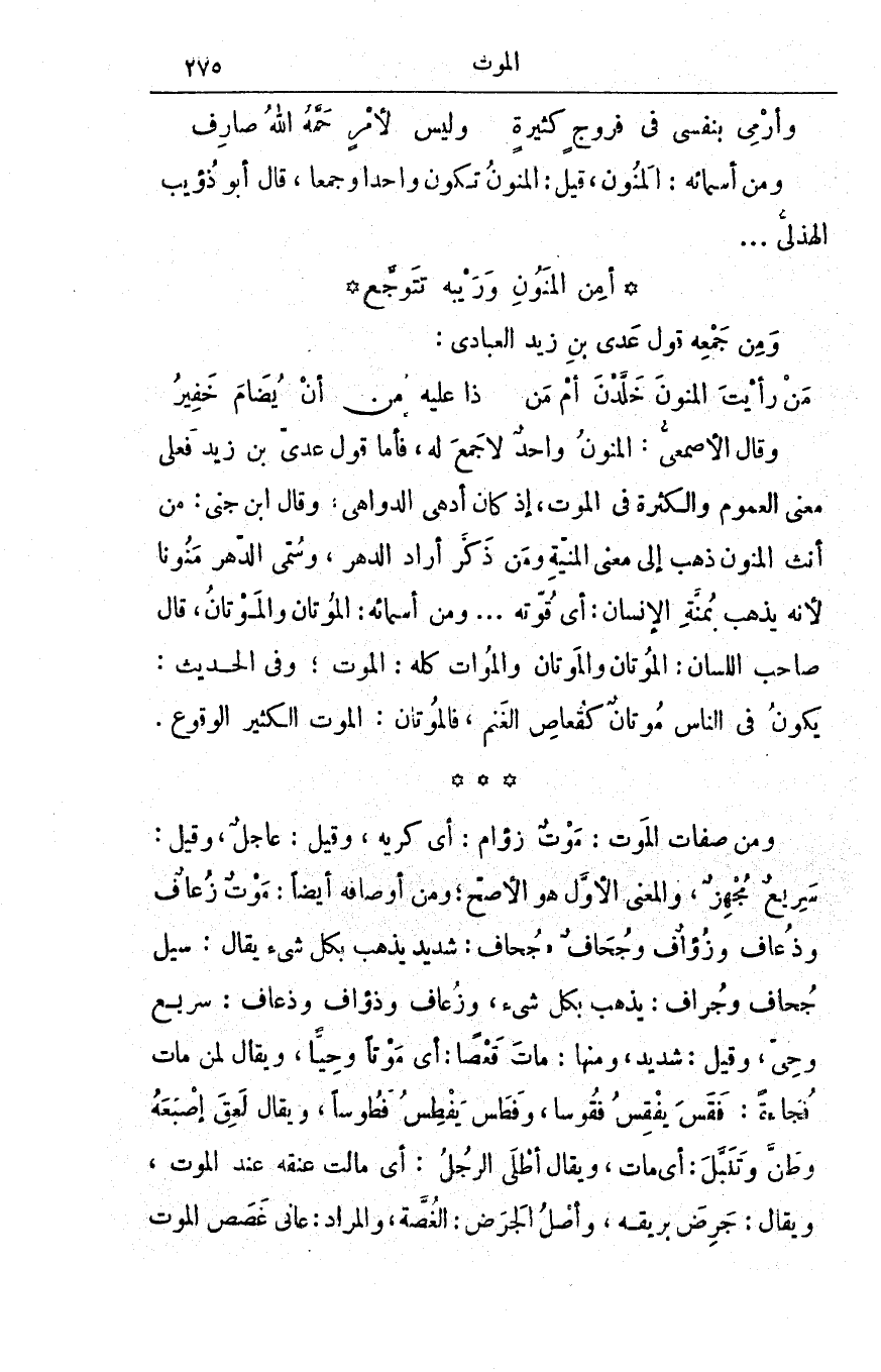 وقال الأصمعيُّ: المنونُ واحدٌ لا جمعَ له، فأمّا قولُ عديِّ بن زيد فَعلى معنى العُموم والكَثرة في الموت، إذ كان أدْهى الدَّواهي، وقال ابن جنّيّ: من أنّث المنونَ ذهبَ إلى مَعْنى المَنيّةِ ومن ذَكَّرَ أراد الدَّهر، وسُمّي الدهرُ مَنوناً لأنّه يذهبُ بِمُنَّةِ الإنسان: أي قوَّته. . . ومن أسمائِه: المُوتان والمَوْتانُ، قال صاحب اللسان: المُوتان والمَوْتان والمُوات كلُّه: الموت؛ وفي الحديث: يكونُ في الناس مُوتانٌ كَقُعاصِ الغَنم، فالموتان: الموتُ الكثيرُ الوقوع.
