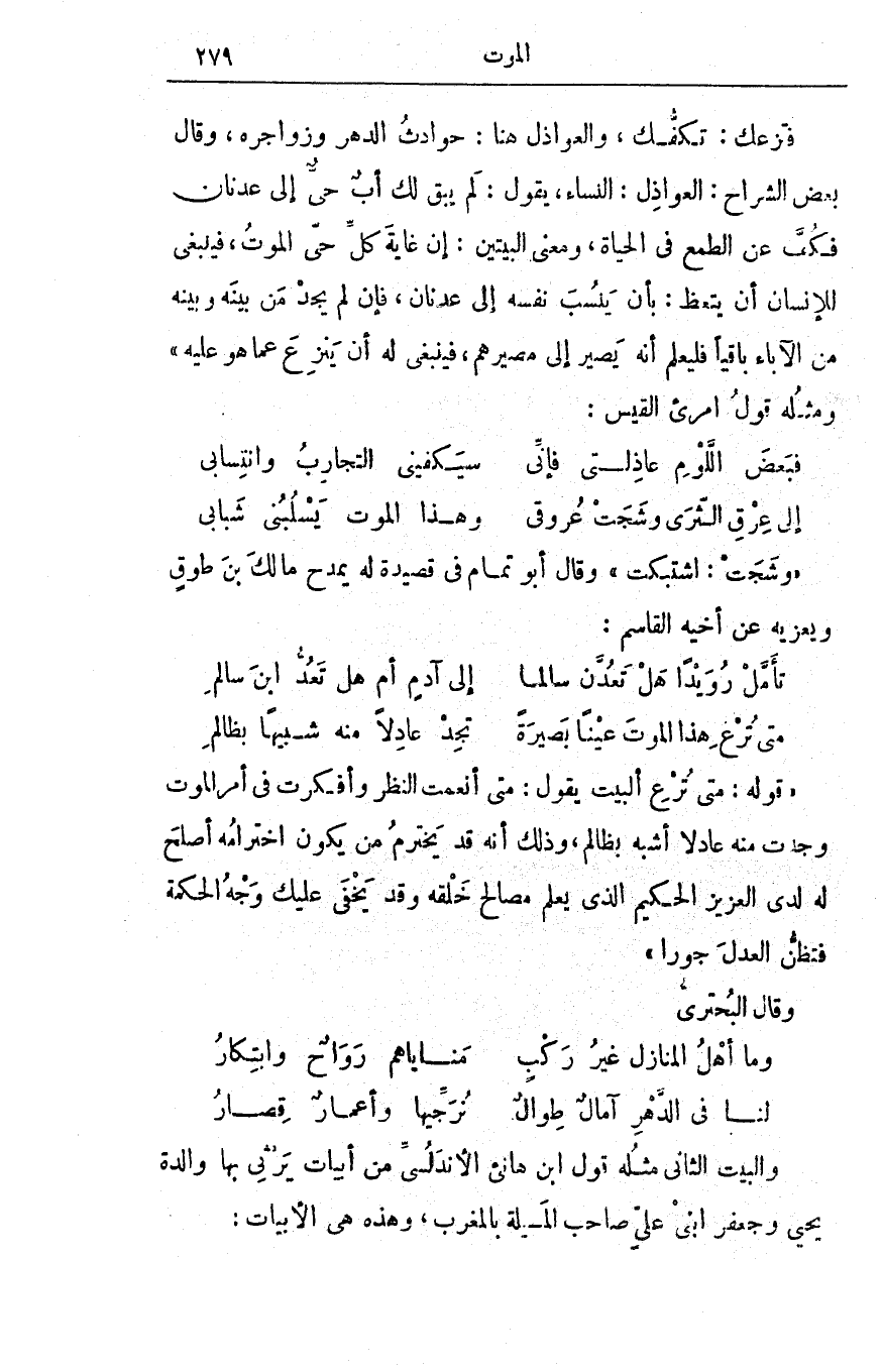 وزواجرُه، وقال بعضُ الشرّاح: العواذلُ: النساء، يقول: لم يبق لك أبٌ حيٌّ إلى عدنان فكفَّ عن الطمع في الحياة، ومعنى البيتين: إنَّ غاية كل حيٍّ الموتُ، فينبغي للإنسانِ أن يتَّعظ: بأن ينسبَ نفسَه إلى عدنان، فإن لم يجد مَنْ بينه وبينه من الآباءِ باقِياً فليعلَمْ أنّه يَصير إلى مصيرهم، فينبغي له أن ينزعَ عمّا هو عليه ومثله قول امرئ القيس: