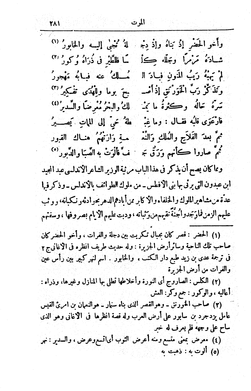 وممّا كان يصحُّ أن يذكرَ في هذا الباب مرثية الوزير الشاعر الأندلسي عبد المجيد بن عبدون التي يرثي بها بني الأفطس - من ملوك الطوائف بالأندلس - وذكر فيها عدّة من مشاهير الملوك والخلفاء والأكابر ممّن أبادهم الدهرُ بحوادثه ونكباته، ووثب عليهم الزمن فما وجدوا جُنَّةً تقيهم من وثباته، ودبَّت عليهم الأيامُ بصروفها، وسقتهم