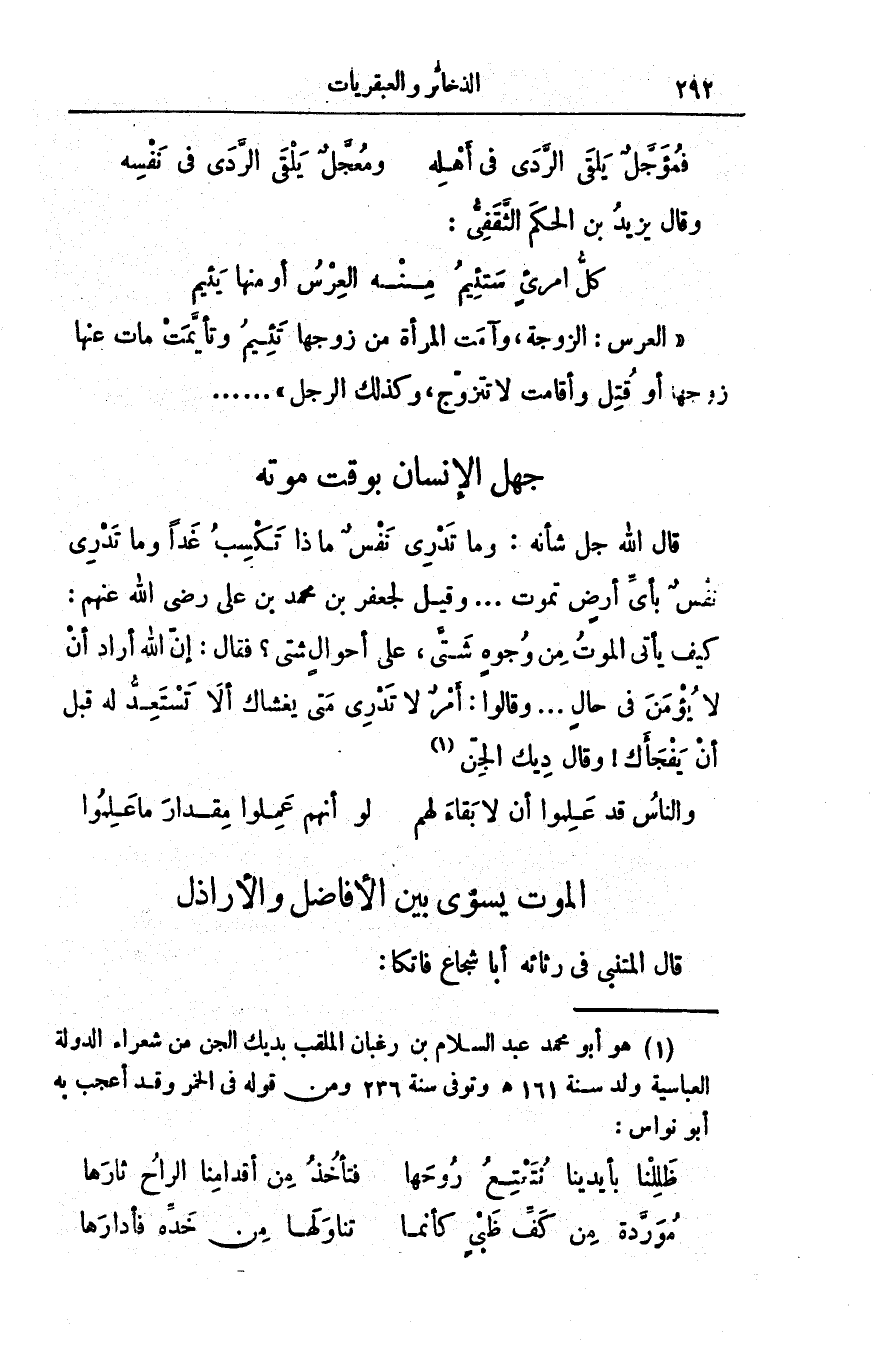 قال اللهُ جلّ شأنه: {تَدْرِي نَفْسٌ مَّاذَا تَكْسِبُ غَداً وَمَا تَدْرِي نَفْسٌ بِأَيِّ أَرْضٍ تَمُوتُ}. . . . وقيل لجعفر بن محمد بن علي رضي الله عنهم: كيفَ يأتي الموتُ من وُجوهٍ شتّى، على أحوالٍ شتّى؟ فقال: إنَّ اللهَ أرادَ أن لا يُؤمنَ في حالٍ. . . وقالوا: أمرٌ لا تدري متى يَغشاك ألا تستَعِدُّ له قبلَ أنْ يَفْجَأكَ! وقال ديكُ الجنّ: