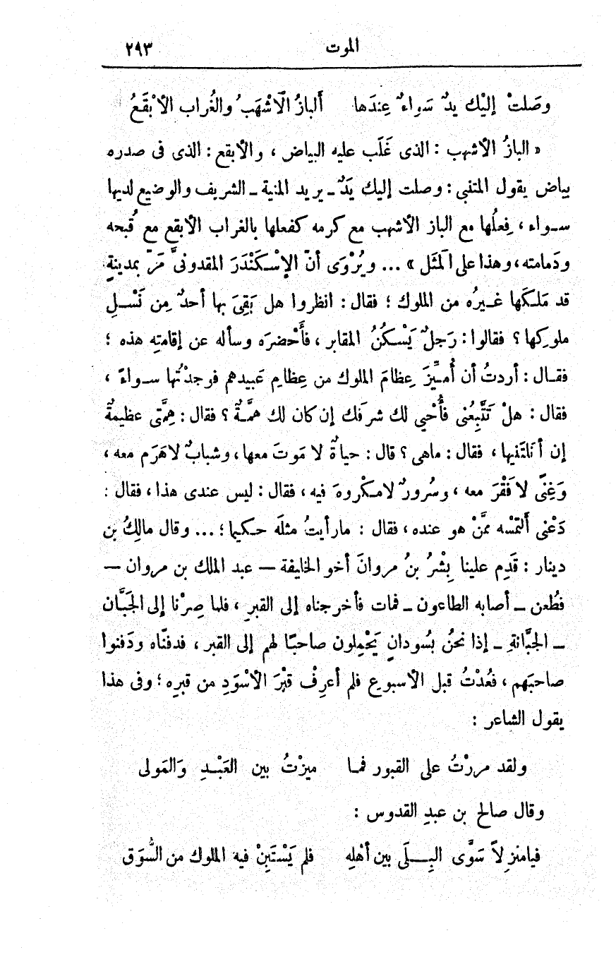 البازُ الأشهب: الذي غلبَ عليه البياضُ، والأبقعُ: الذي في صدره بياضٌ يقول المتنبي: وصلت إليك يدٌ - يريد المنية - الشريفُ والوضيعُ لديها سواء، فِعلُها مع الباز الأشهبِ مع كرمِه كفعلِها بالغرابِ الأبْقَعِ مع قبحِه ودمامتِه، وهذا على المثل. . . ويُروى أنّ الإسكندر المقدونيَّ مرَّ بمدينةٍ قد ملَكَها غيرُه من الملوكِ؛ فقال: انظُروا هل بقيَ بها أحدٌ من نَسْلِ مُلوكِها؟ فقالوا: رجلٌ يسكنُ المقابِرَ، فأحضرَه وسألَه عن إقامتِه هذه؛ فقال: أرَدْتُ أنْ أميِّزَ عظامَ الملوكِ من عظامِ عبيدِهم فوجدتُها سواءً، فقال: هل تتَّبِعُني فأحْيي لك شرفَك إن كان لك همَّةٌ؟ فقال: هِمَّتي عظيمةٌ إن أنَلْتَنيها، فقال: ما هي؟ قال: حياةٌ لا موتَ معها، وشبابٌ لا هرمَ معه، وغِنًى لا فقرَ معه، وسرورٌ لا مكروهَ فيه، فقال: ليس عندي هذا، فقال دَعْني ألْتَمِسْه مِمَّن هو عندَه، فقال: ما رأيتُ مثلَه حكيماً؛. . . وقال مالك بن دينار: قدِمَ علينا بِشرُ بنُ مروان أخو الخليفة - عبد الملك بن مروان - فطُعن - أصابه الطاعون - فماتَ فأخْرَجْناه إلى القبر، فلما صِرْنا إلى الجبّان - الجبّانة - إذا نحنُ بِسودانٍ يَحمِلون صاحِباً لهم إلى القبر، فدَفَنّاه ودَفَنوا صاحبَهم، فعُدْتُ قبل الأسبوعِ فلَمْ أعرف قبرَ الأسودِ من قبرِه؛ وفي هذا يقول الشاعر: