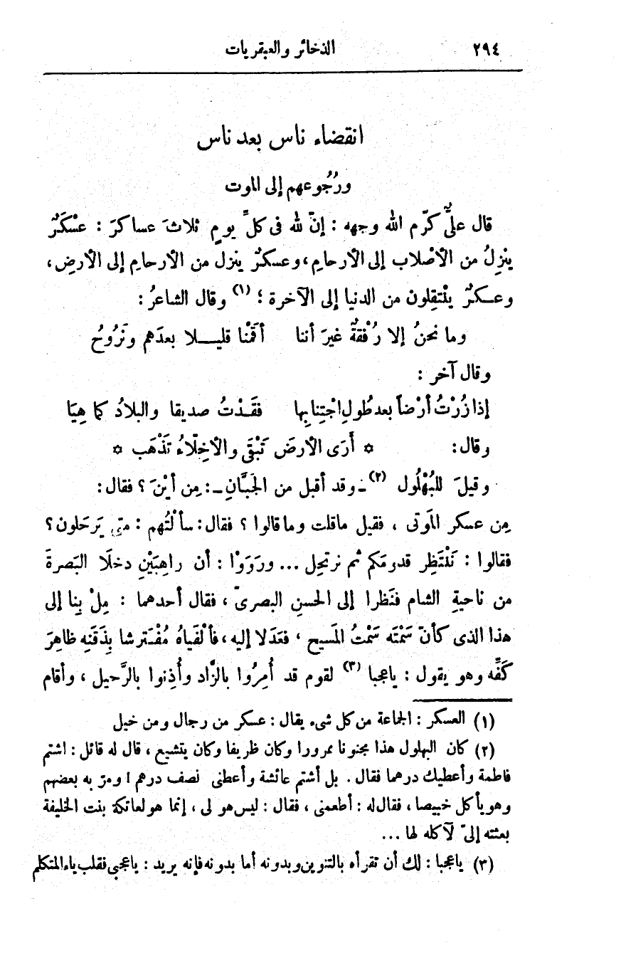 قال عليٌّ كرَّم اللهُ وجهَه: إنَّ للهِ في كلِّ يَوْمٍ ثلاثَ عَساكِرَ: عسكرٌ يَنْزِلُ من الأصْلابِ إلى الأرْحام، وعَسْكرٌ ينزل من الأرْحامِ إلى الأرضِ، وعسكرٌ ينتقلون من الدُّنيا إلى الآخرة، وقال الشاعر: