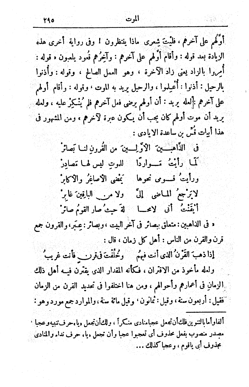 أوَّلُهم على آخرِهم، فليتَ شِعْري ماذا يَنْتَظرون! وفي روايةٍ أخرى هذه الزيادةُ بعد قوله: وأقام أولهم على آخرهم: وآخرهم قعودٌ يلعبون قوله: أمِروا بالزّاد يعني زادَ الآخرة، وهو العملُ الصالح، وقوله: وأذنوا بالرحيل: أذِنوا: أُعْلِموا، والرحيل يريد به الموتَ، وقوله: وأقام أوّلُهم على آخرِهم: لعلّه يريد: أنّ أوّلَهم يرضى فعلَ آخرِهم فلَمْ يُنْكِرْ عليه، ولعلّه يريد أن موتَ أوّلهم كان يجب أن يكون عبرةً لآخرِهم ومن المشهور في هذا أبياتُ قُسِّ بنِ ساعدةَ الأيادي: