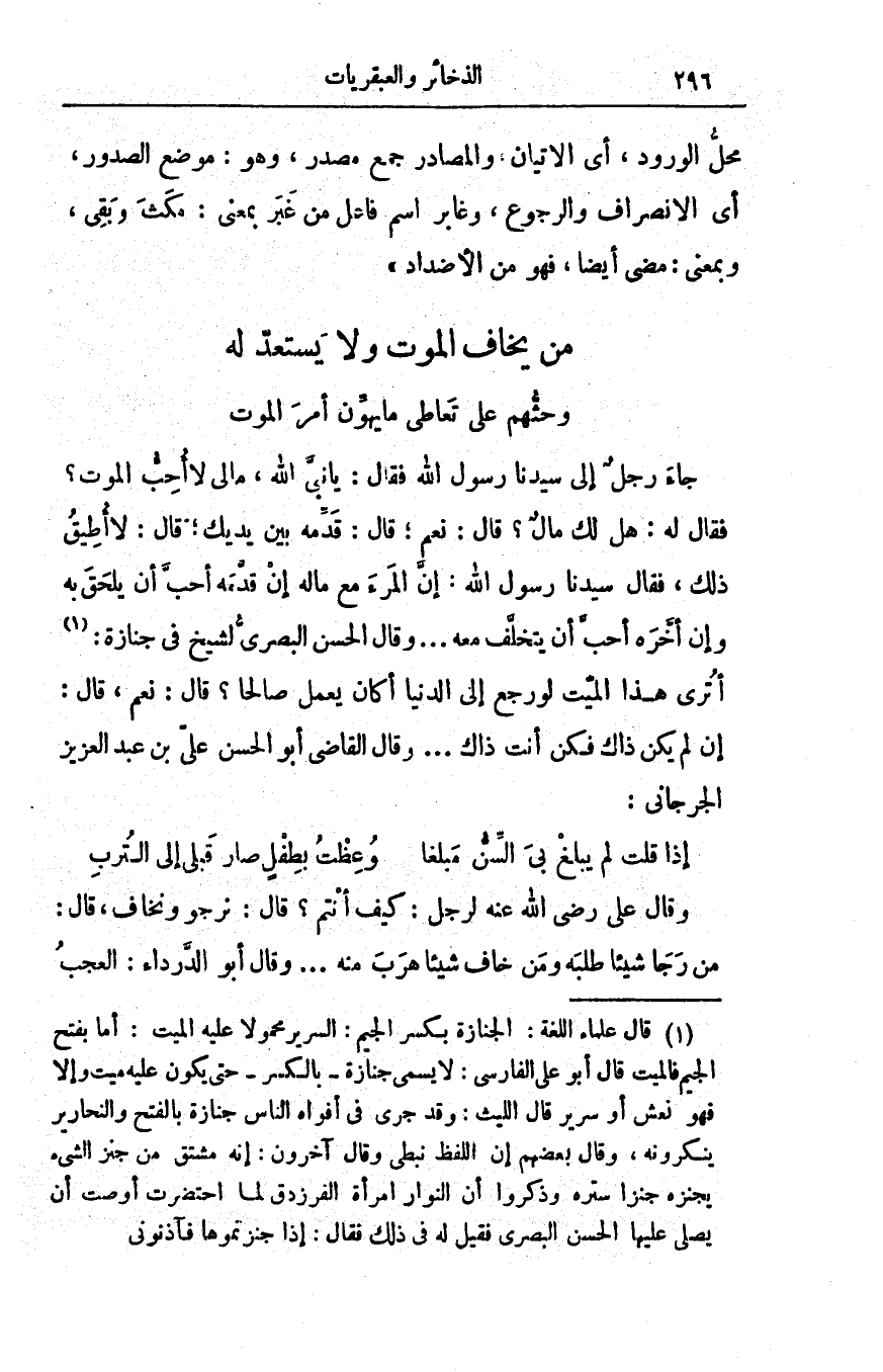 جاءَ رجلٌ إلى سيّدنا رسولِ الله فقال: (يا نبيَّ الله، ما لي لا أحبُّ الموتَ؟ فقال له: هل لك مالٌ؟ قال: نَعَم؛ قال: قدِّمْه بين يَديك؛ قال: لا أطيقُ ذلك، فقال سيدُنا رسولُ الله: إنَّ المرءَ مع مالِه إنْ قدَّمه أحبَّ أنْ يلحقَ به وإنْ أخَّرَه أحَبَّ أن يتخلَّفَ معه). . . وقال الحسنُ البصريُّ لشيخٍ في جنازة: أتُرى هذا الميّت لو رجعَ إلى الدُّنيا أكان يعمل صالحاً؟ قال: نعم، قال: إن لم يكن ذاك فكُنْ أنتَ ذاك. . . وقال القاضي أبو الحسن علي بن عبد العزيز الجُرجانيّ:
