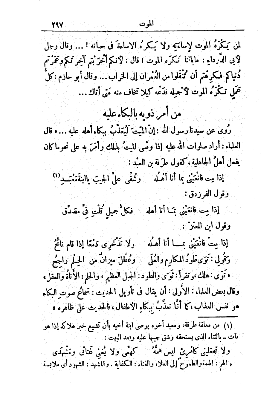 رُوي عن سيِّدنا رسول الله: (إنَّ الميِّتَ ليُعَذَّب ببُكاءِ أهلِه عليه). . . قال العلماء: أراد صلواتُ الله عليه إذا وَصَّى الميتُ بذلك وأمرَ به على نحو ما كان يفعلُ أهلُ الجاهلية، كقولِ طرفةَ بن العبد: