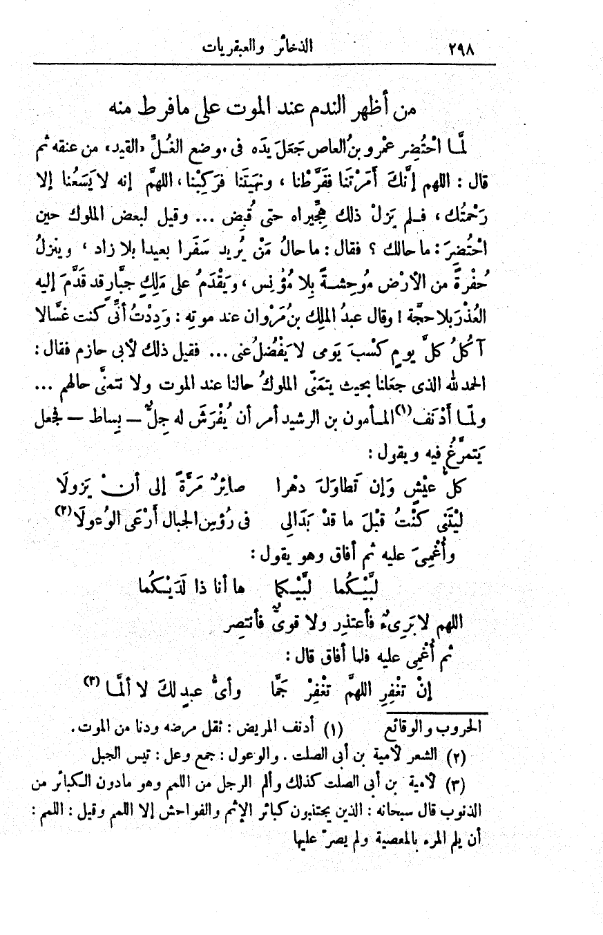 لما احتُضِرَ عمرو بنُ العاص جعلَ يدَه في موضع الغُلِّ القيد من عُنُقِه ثم قال: اللَّهمَّ إنك أمَرْتَنا ففرّطنا، ونَهَيْتَنا فرَكِبْنا، اللَّهمَّ إنّه لا يَسَعُنا إلا رحمتُك، فلَمْ يزَلْ ذلك هِجِّيراه حتّى قُبِضَ. . . وقيل لبعض الملوك حين احتُضِرَ: ما حالك؟ فقال: ما حالُ مَنْ يريدُ سفراً بعيداً بلا زادٍ، وينزل حفرةً من الأرض موحشةً بلا مُؤنس، ويَقْدَمُ على ملكٍ جبّار قد قدَّم إليه العُذْرَ بلا حُجّة! وقال عبد الملك بن مروان عند موتِه: وَدِدْتُ أنّي كنتُ غَسّالاً آكلُ كلَّ يومٍ كسبَ يومي لا يفضُلُ عنّي. . . فقيل ذلك لأبي حازم فقال: الحمدُ لله الذي جعلَنا بحيث يتمنّى الملوكُ حالَنا عند الموتِ ولا نتمنّى حالَهم. . . ولمّا أدْنَفَ المأمونُ بن الرشيد أمرَ أن يُفرشَ له جِلٌّ - بساط - فجَعلَ يتمرَّغ فيه ويقول: