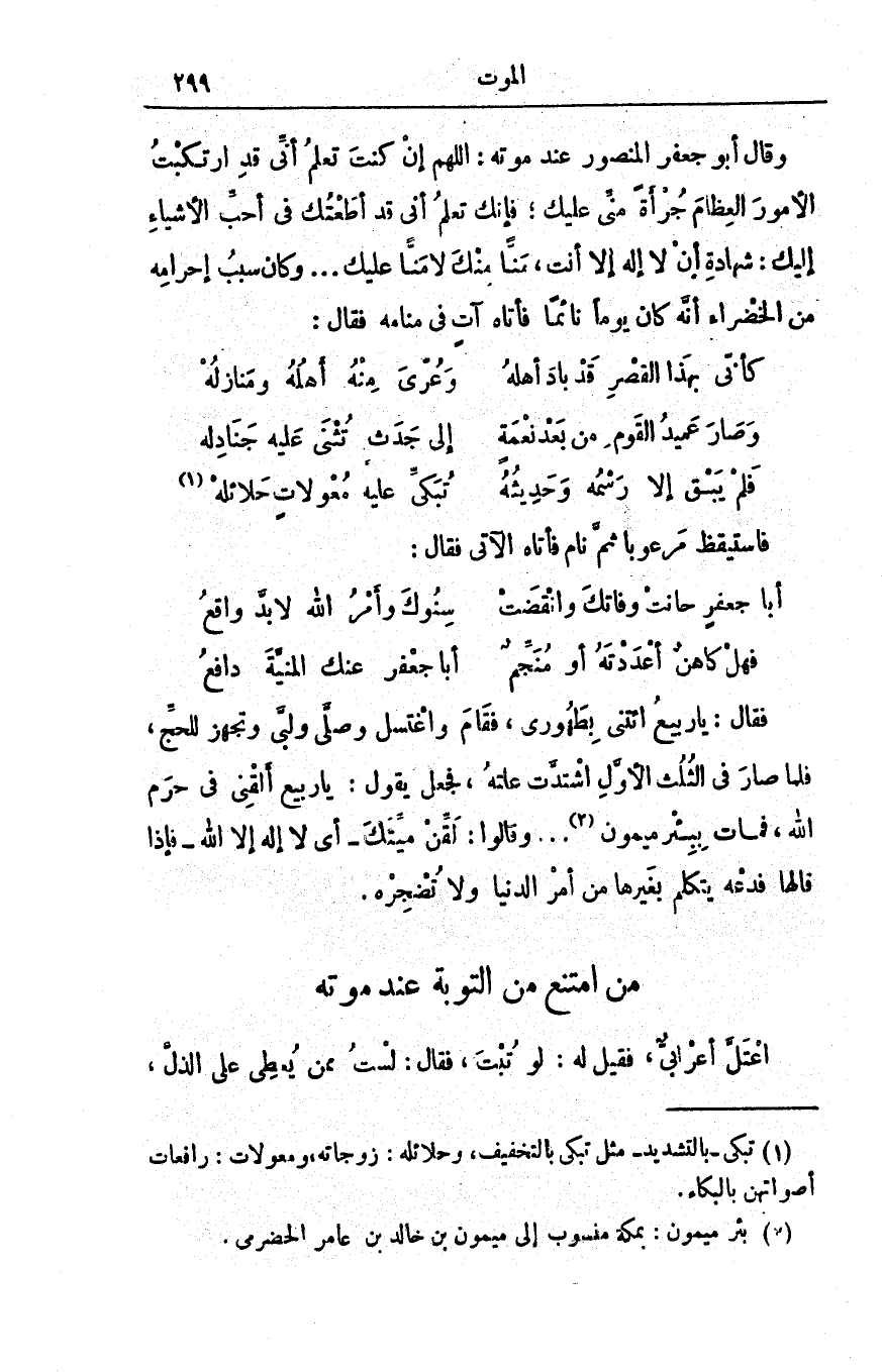 فقال: يا ربيعُ ائْتِني بِطَهوري، فقام واغتسلَ وصلَّى ولبَّى وتجهَّز للحَجِّ، فلمّا صار في الثلثِ الأوَّل اشتدَّت عِلَّتُه، فجعل يقول: يا ربيعُ ألقِني في حَرَمِ اللهِ، فماتَ ببِئْرِ مَيْمون. . . وقالوا: لَقِّنْ ميِّتَك - أي لا إله إلا الله - فإذا قالَها فدَعْه يتكلَّمْ بغيرِها من أمرِ الدُّنيا ولا تُضجِّرْه.