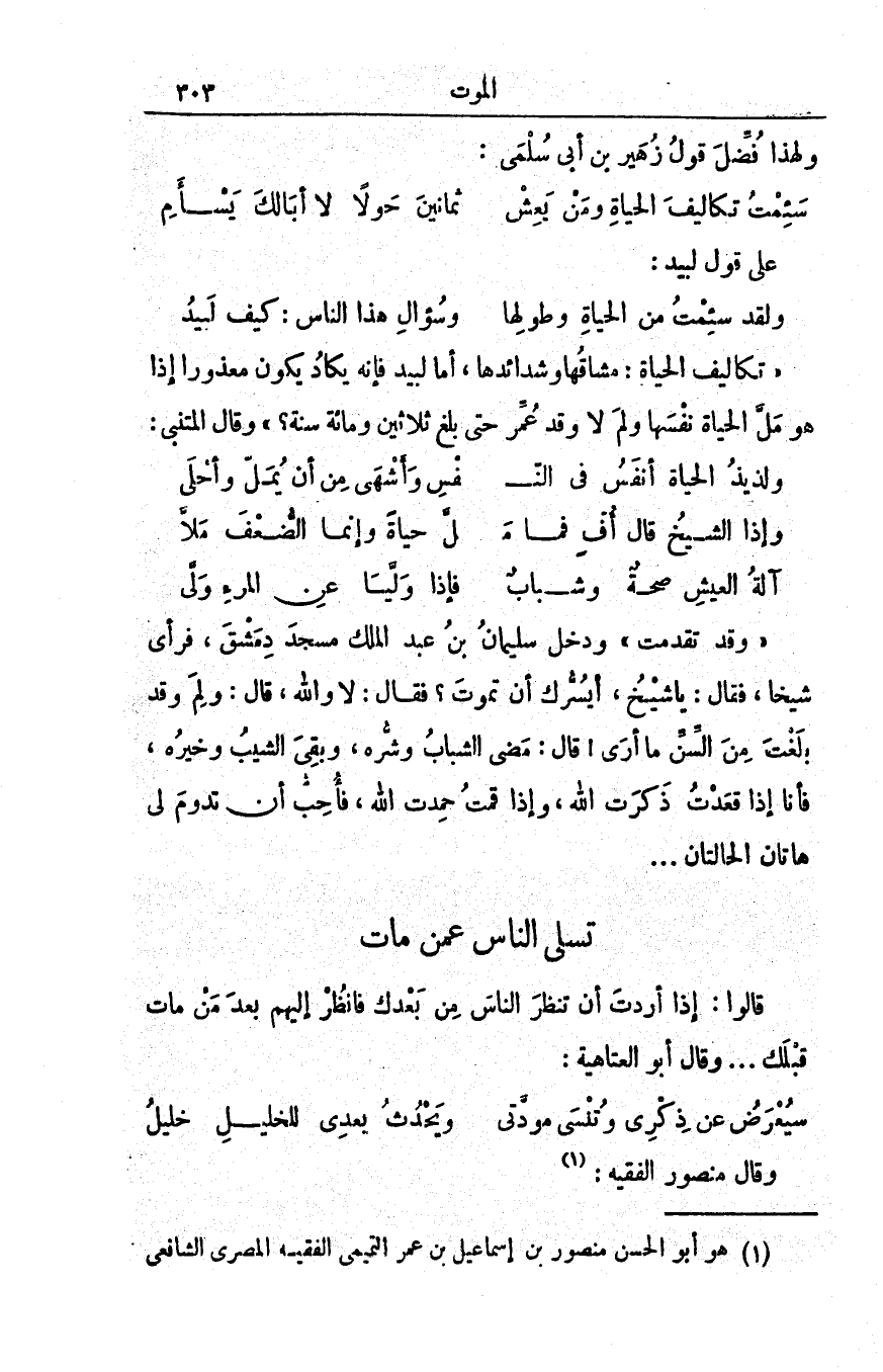 وقد تقدّمت ودخل سليمان بنُ عبد الملك مسجدَ دمشقَ، فرأى شيخاً، فقال: يا شيخُ، أيسرُّك أن تموتَ؟ فقال: لا واللهِ، قال: ولِمَ وقد بَلَغْتَ من السِّنِّ ما أرى! قال: مَضى الشبابُ وشرُّه، وبَقِيَ الشّيْبُ وخيرُه، فأنا إذا قعَدْتُ ذكرْتُ اللهَ، وإذا قُمْتُ حَمِدْتُ اللهَ، فأحِبُّ أنْ تدومَ لي هاتان الحالتان. . .