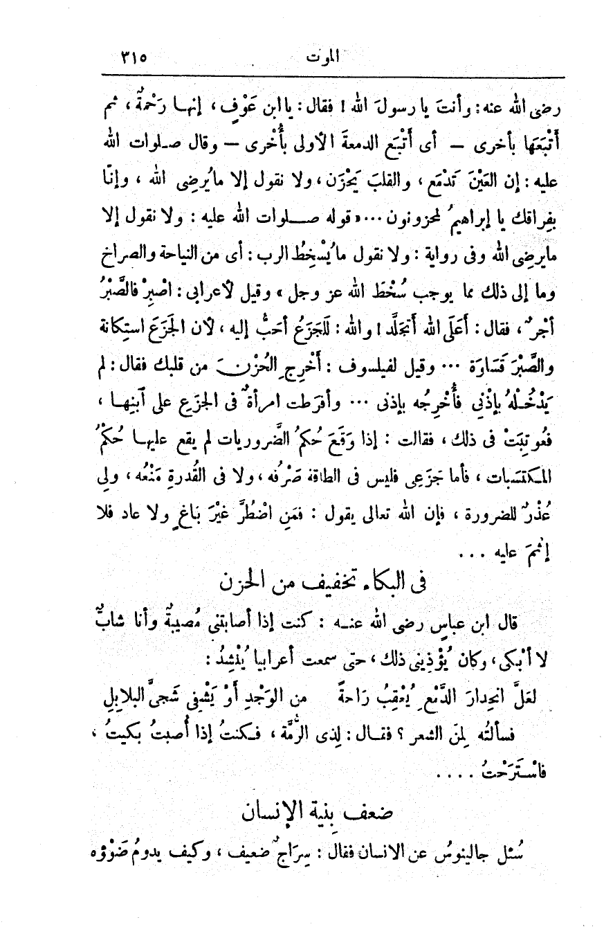 عوفٍ، إنّها رحمةٌ، ثمَّ أتبعها بأخرى - أي أتبعَ الدمعةَ الأولى بأخرى - وقال صلواتُ اللهِ عليه: إنّ العينَ تدمعُ، والقلبَ يحزنُ، ولا نقول إلا ما يُرضي الله، وإنّا بفِراقِك يا إبراهيمُ لمَحْزونون). . قوله صلوات الله عليه: ولا نقول إلا ما يُرضي اللهَ وفي رواية: ولا نقول ما يُسخِطُ الرّب: أي من النّياحة والصُّراخ وما إلى ذلك ممّا يُوجب سُخْطَ الله عز وجل وقيل لأعرابيٍّ: اصبر فالصَّبرُ أجرٌ، فقال: أعلى اللهِ أتَجَلَّد! واللهِ: لَلْجَزَعُ أحبُّ إليه، لأنَّ الجزعَ استكانةٌ والصبرَ قَساوة. . . وقيل لفيلسوف: أخرجِ الحُزنَ من قلبك فقال: لم يَدْخُلْه بإذْني فأخْرِجُه بإذني. . . وأفرطت امرأةٌ في الجزعِ على ابنها، فعُوتبت في ذلك، فقالت: إذا وقعَ حكمُ الضَّروريّات لم يَقَعْ عليها حكمُ المُكْتَسبات، فأمّا جَزعي فليسَ في الطَّاقةِ صرفُه، ولا في القُدْرَةِ مَنْعُه، ولي عُذْرٌ للضّرورة، فإنّ اللهَ تعالى يقول: {فَمَنِ اضْطُرَّ غَيْرَ بَاغٍ وَلاَ عَادٍ فَلا إِثْمَ عَلَيْهِ}. . .