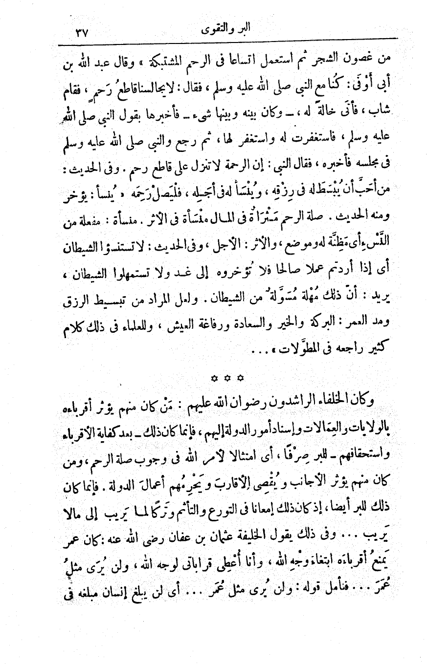 وكان الخلفاء الراشدون رضوان الله عليهم: مَن كان منهم يؤثر أقرباءه بالولايات والعِمالات وإسناد أمور الدولة إليهم، فإنما كان ذلك - بعد كفاية الأقرباء واستحقاقهم - للبر صِرْفاً، أي امتثالاً لأمر الله في وجوب صلة الرحم، ومن كان منهم يؤثر الأجانب ويُقصي الأقارب ويحرمهم أعمالَ الدولة. فإنما كان ذلك للبر أيضاً، إذ كان ذلك إمعاناً في التورع والتأثم وتَركاً لما يريب إلى ما لا يريب. . . وفي ذلك يقول الخليفة عثمان بن عفان رضي الله عنه: كان عمر يمنع أقرباءه ابتغاء وجهِ الله، وأنا أعطي قراباتي لوجه الله، ولن يُرى مثلُ عمر. . . فتأمل قوله: ولن يُرى مثل عُمر. . . أي لن يبلغ إنسان مبلغه في
