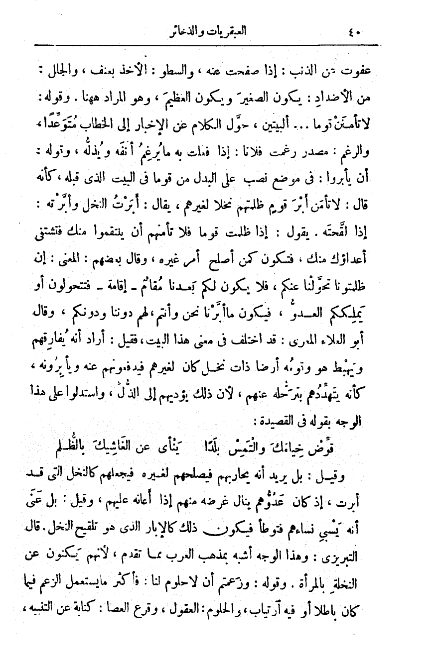 تأمن أبر قومٍ ظلمتهم نخلاً لغيرهم، يقال: أبَرْتُ النخل وأبَّرْتُه: إذا لقّحته. يقول: إذا ظلمت قوماً فلا تأمنهم أن ينتقموا منك فتشتفي أعداؤك منك. فتكون كمن أصلح أمر غيره، وقال بعضهم: المعنى: إن ظلمتمونا تحولنا عنكم، فلا يكون لكم بعدنا مقام - إقامة - فتتحولون أو يملككم العدو، فيكون ما أبرنا نحن وأنتم، لهم دوننا ودونكم، وقال أبو العلاء المعري: قد اختلف في معنى هذا البيت، فقيل: أراد أنه يفارقهم ويهبط هو وقومه أرضاً ذات نخل كان لغيرهم فيدفعونهم عنه ويأبرونه، كأنه يتهددهم بترحله عنهم، لأن ذلك يؤديهم إلى الذل، واستدلوا على هذا الوجه بقوله في القصيدة: