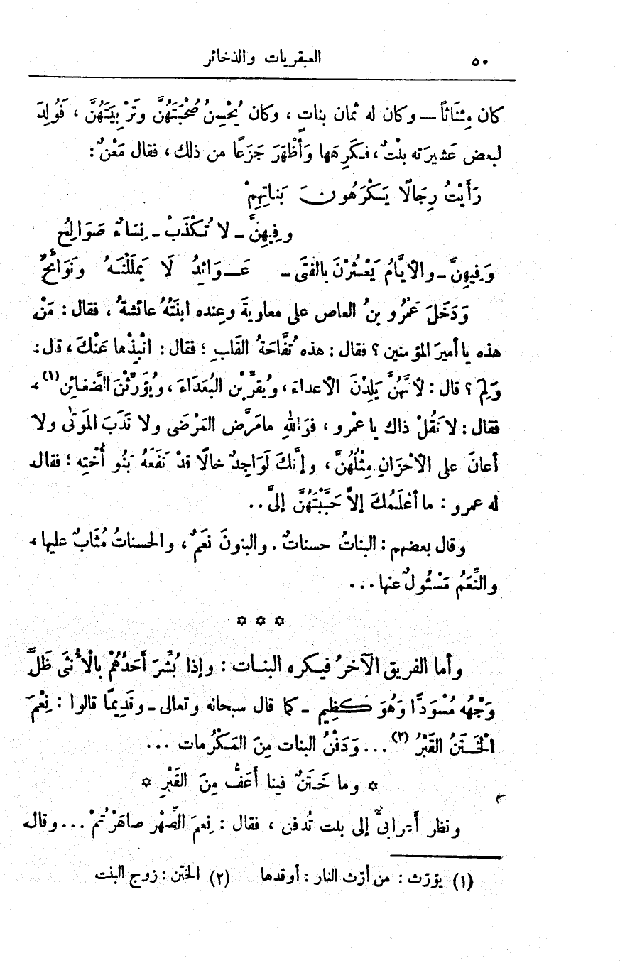 وأما الفريق الآخر فيكره البنات: {وَإِذَا بُشِّرَ أَحَدُهُمْ بِالأُنثَى ظَلَّ وَجْهُهُ مُسْوَدّاً وَهُوَ كَظِيمٌ} - كما قال سبحانه وتعالى - وقديماً قالوا: نِعْم الخَتَنُ القبرُ. . . ودفنُ البنات من المَكْرُمات. .