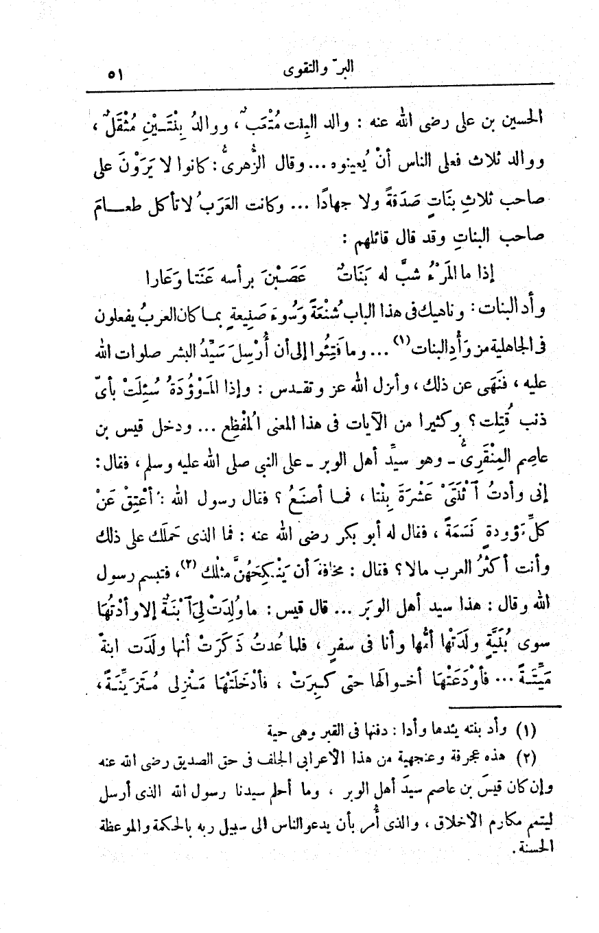 وأد البنات: وناهيك في هذا الباب شُنعةً وسوءَ صنيعةٍ بما كان العرب يفعلون في الجاهلية من وأد البنات. . وما فتئوا إلى أن أرسِل سيِّدُ البشر صلوات الله عليه، فنهى عن ذلك، وأنزل الله عز وتقدس: {وَإِذَا الْمَوْءُودَةُ سُئِلَتْ، بِأَيِّ ذَنبٍ قُتِلَتْ}؟ وكثيراً من الآيات في هذا المعنى المفظِع. . . ودخل قيس بن عاصم المِنْقَريُّ - وهو سيِّد أهل الوبر - على النبي صلى الله عليه وسلم، فقال: إني وأدت اثنتي عشرة بنتاً، فما أصنع؟ فقال رسول الله: أعتق عن كل موءودة نسمةً، فقال له أبو بكر رضي الله عنه: فما الذي حملك على ذلك وأنت أكثر العرب مالاً؟ فقال: مخافة أن يَنْكِحَهنَّ مثلك، فتبسم رسول الله وقال: هذا سيّد أهل الوبر. . . قال قيس: ما وُلدت لي ابنةٌ إلا وأدتها سوى بنيّةٍ ولدتها أمُّها وأنا في سفر، فلما عدت ذكرت أنّها ولدت ابنة ميّتة. . فأودعتها أخوالها حتى كبرت، فأدخلتها منزلي متزيِّنة،