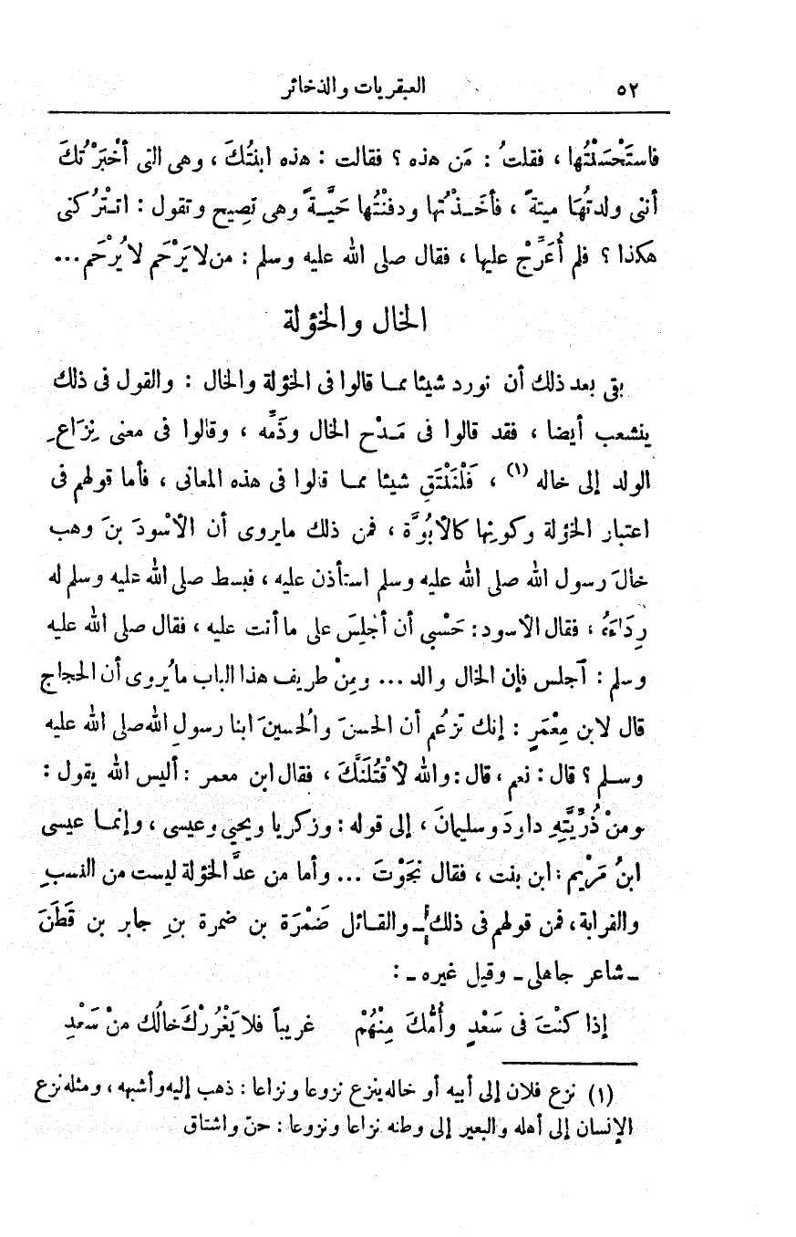 فإن الخال والدٌ. . . ومن طريف هذا الباب ما يُروى أن الحجاج قال لابن معمر: إنك تزعم أن الحسن والحسين ابنا رسول الله صلى الله عليه وسلم؟ قال: نعم، قال: والله لأقتلنك، فقال ابن معمر: أليس الله يقول: ومن ذريته داوود وسليمان، إلى قوله: وزكريا ويحيى وعيسى، وإنما عيسى بن مريم: ابن بنت، فقال نجوت. . . وأما من عدّ الخؤولة ليست من النسب والقرابة، فمن قولهم في ذلك - والقائل ضَمْرَة بن ضمرة بن جابر بن قَطَن - شاعر جاهلي - وقيل غيره -: