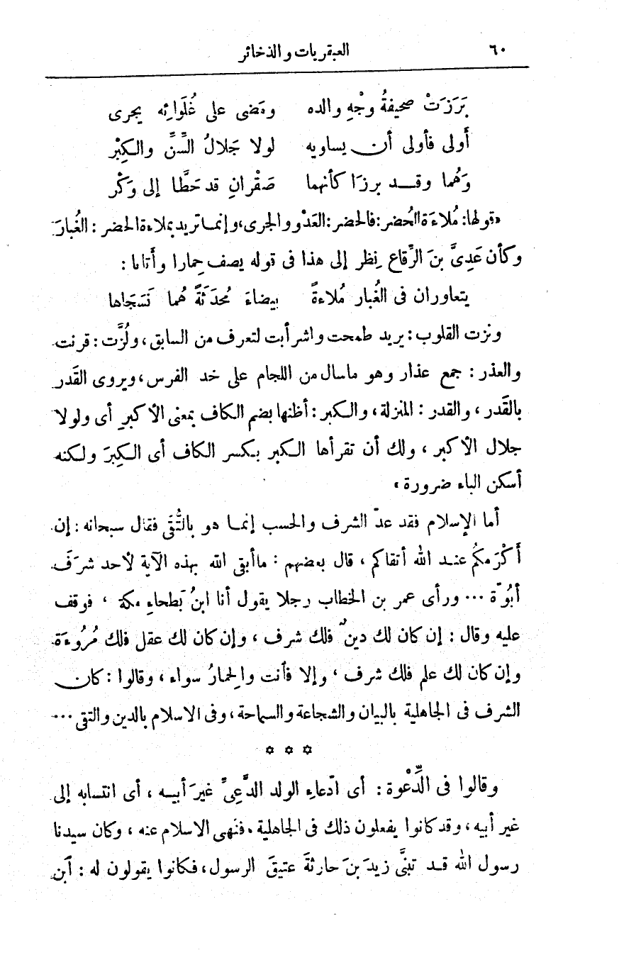 أما الإسلام فقد عد الشرف والحسب إنما هو بالتقى فقال سبحانه: {إِنَّ أَكْرَمَكُمْ عِندَ اللَّهِ أَتْقَاكُمْ}، قال بعضهم: ما أبقى الله بهذه الآية لأحد شرفَ أبوّة. . . ورأى عمر بن الخطاب رجلاً يقول أنا ابن بطحاءِ مكة، فوقف عليه وقال: إن كان لك دينٌ فلك شرف، وإن كان لك عقلٌ فلك مروءة وإن كان لك علم فلك شرف، وإلا فأنت والحمار سواء، وقالوا: كان الشرف في الجاهلية بالبيان والشجاعة والسماحة، وفي الإسلام بالدين والتقى. . .