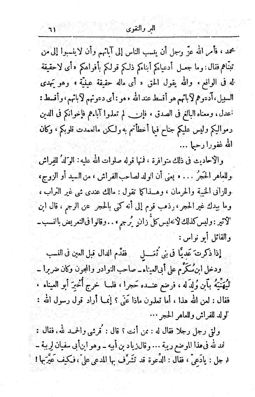 ولقي رجلٌ رجلاً فقال له: ممن أنت؟ قال: قُرشي والحمد لله، فقال: الحمد لله في هذا الموضع ريبة. . وقال زياد بن أبيه - وهو ابن أبي سفيان لرببة - لرجل: يا دَعيّ، فقال: الدِّعْوة قد تشرّف بها المُدَّعي عليّ، فكيف عيّرَ بها!
