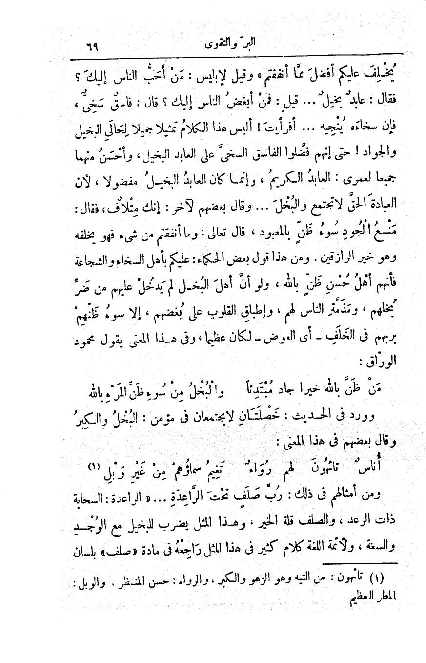 يخلف عليكم أفضل مما أنفقتم وقيل لإبليس: مَن أحبُّ الناس إليك؟ فقال: عابدٌ بخيل. . قيل: فمن أبغض الناس إليك؟ قال: فاسِقٌ سخي، فإن سخاءه يُنجيه. . . أفرأيت! أليس هذا الكلام تمثيلاً جميلاً لحالَيْ البخيل والجواد! حتى إنهم فضلوا الفاسق السخي على العابد البخيل، وأحسن منهما جميعاً لعمري: العابد الكريم، وإنما كان العابد البخيل مفضولاً، لأن العبادة الحق لا تجتمع والبخلَ. . . وقال بعضهم لآخر: إنك متلافٌ، فقال: مَنْعُ الجودِ سوءُ ظنٍّ بالمَعْبود، قال تعالى: {وَمَا أَنفَقْتُم مِّن شَيْءٍ فَهُوَ يُخْلِفُهُ وَهُوَ خَيْرُ الرَّازِقِينَ}. ومن هذا قول بعض الحكماء: عليكم بأهل السخاء والشجاعة فإنهم أهل حسن ظن بالله، ولو أن أهل البخل لم يدخل عليهم من ضرِّ بخلهم، ومذمَّةِ الناس لهم، وإطباق القلوب على بُغضهم، إلا سوءُ ظنّهم بربهم في الخَلَف - أي العَوض - لكان عظيماً، وفي هذا المعنى يقول محمود الوراق: