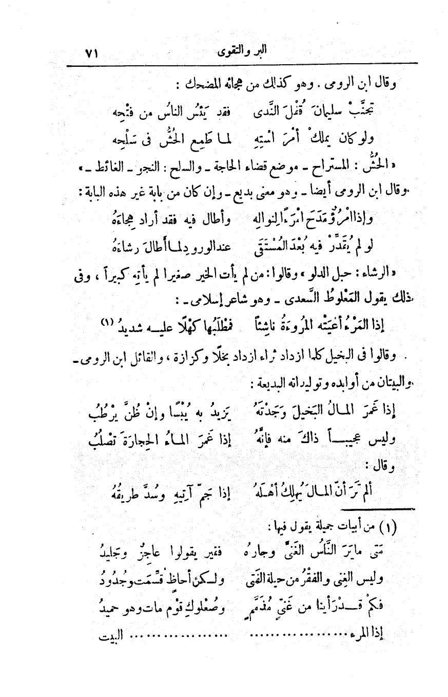 ألم تَرَ أنَّ المالَ يُهلِكُ أهْلَهُ ... إذا جَمّ آتِيهِ وسُدَّ طريقُهُ
