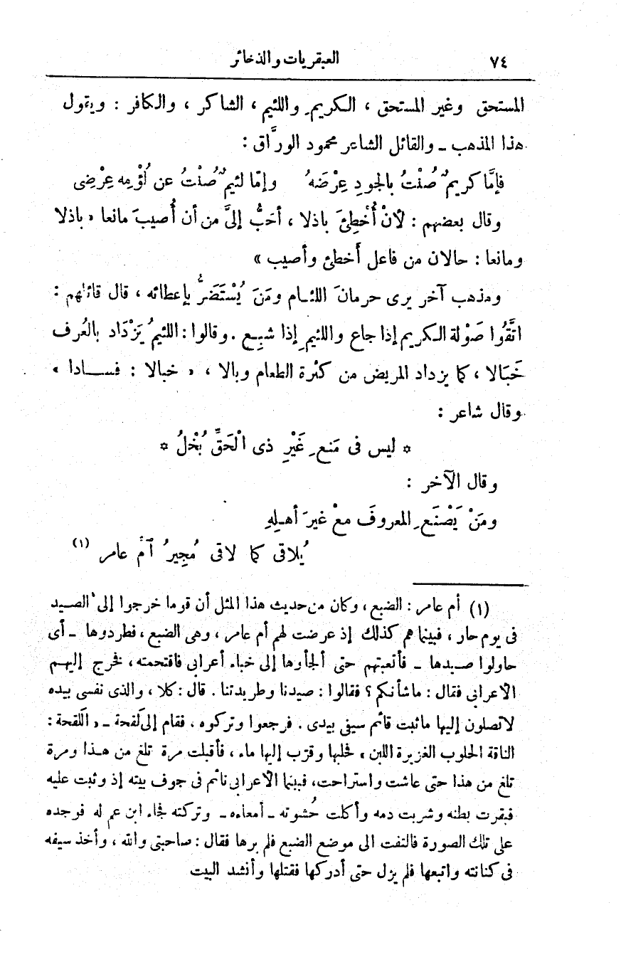 ومذهب آخر يرى حرمانَ اللئام ومن يُستَضَرُّ بإعطائه، قال قائلهم: اتقوا صولةَ الكريم إذا جاع واللئيم إذا شبع. وقالوا: اللئيم يزداد بالعُرْفِ خَبالاً، كما يزداد المريضُ من كثرة الطعام وبالاً، خبالاً: فساداً.