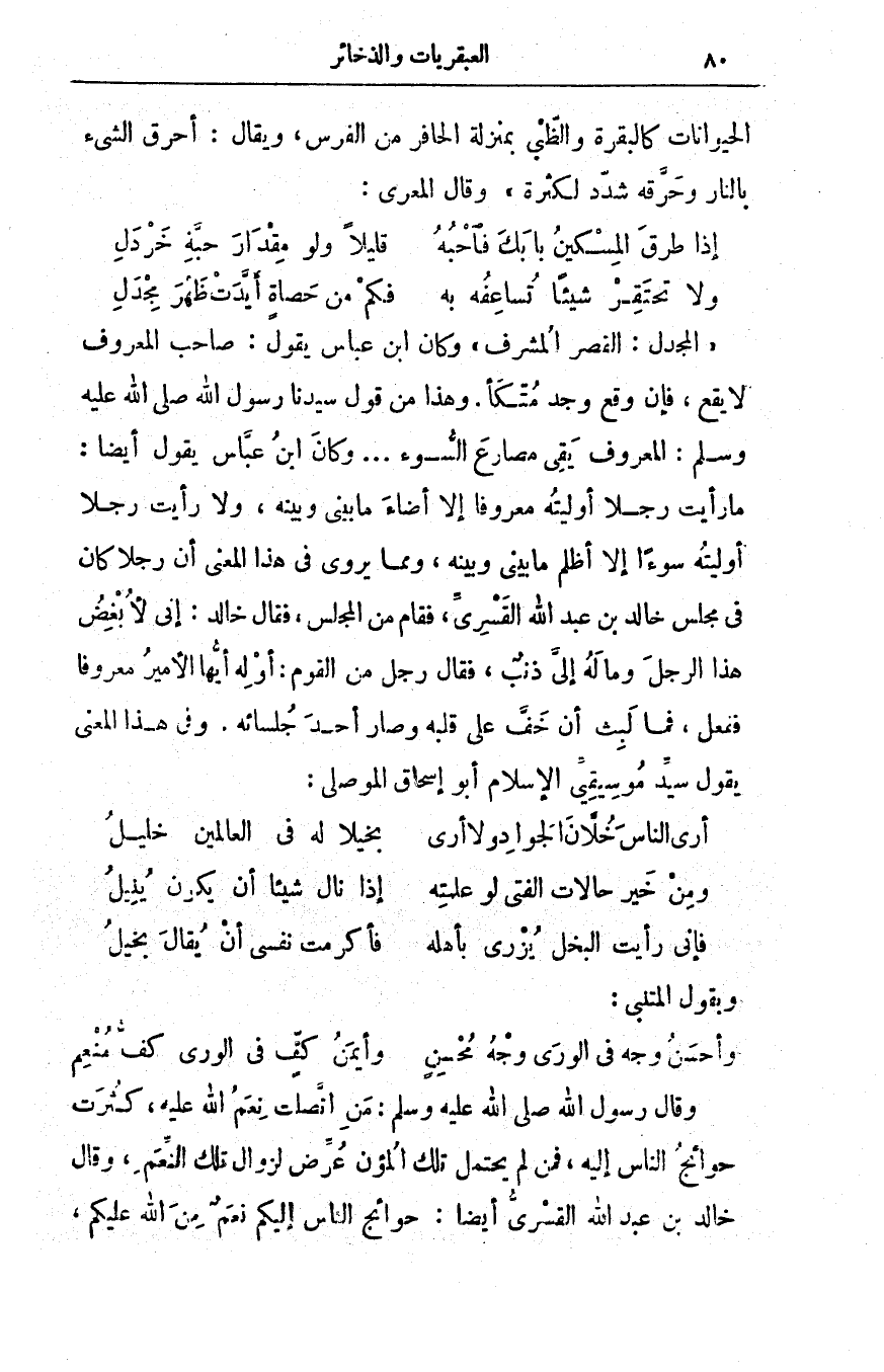 المجدل: القصر المشرف وكان ابن عباس يقول: صاحب المعروف لا يقع، فإن وقع وجد متّكأً. وهذا من قول سيدنا رسول الله صلى الله عليه وسلم: (المعروف يقي مصارع السوء). . . وكان ابن عباس يقول أيضاً: ما رأيت رجلاً أوليته معروفاً إلا أضاء ما بيني وبينه، ولا رأيت رجلاً أوليته سوءاً إلا أظلم ما بيني وبينه، ومما يروى في هذا المعنى أن رجلاً كان في مجلس خالد بن عبد الله القسري، فقام من المجلس، فقال خالد: إني لأبغِضُ هذا الرجل وما له إليّ ذنبٌ، فقال رجلٌ من القوم: أولِه أيّها الأميرُ معروفاً ففعل، فما لبث أن خفَّ على قلبه وصار أحدَ جلسائه. وفي هذا المعنى يقول سيّد موسيقي الإسلام أبو إسحاق الموصلي: