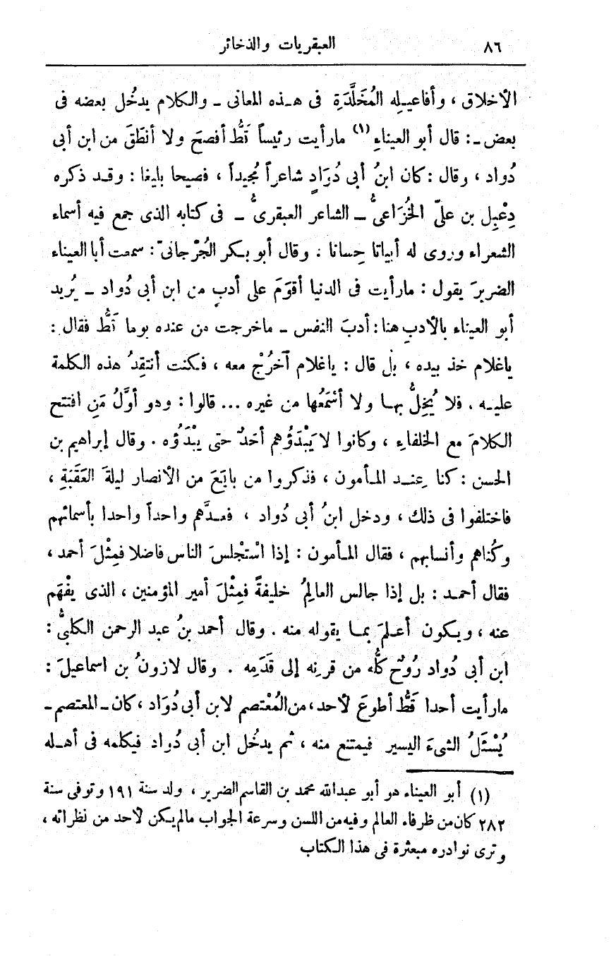 الأخلاق، وأفاعيلِه المخلَّدة في هذه المعاني - والكلام يدخلُ بعضُه في بعض -: قال أبو العيناء ما رأيت رئيساً قطّ أفصحَ ولا أنطقَ من ابن أبي دُواد، وقال: كان ابن أبي دُوادٍ شاعراً مُجيداً، فَصيحاً بليغاً: وقد ذكره دِعْبِل بن عليّ الخزاعي - الشاعر العبقري -