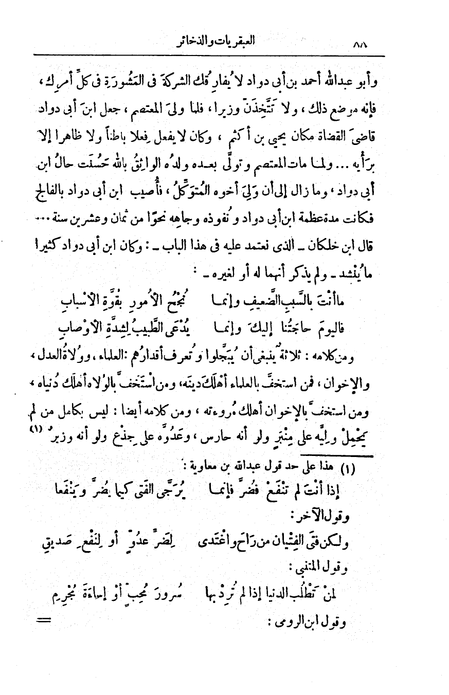 وأبو عبد الله أحمد بن أبي دُواد لا يفارقك الشِّرْكة في المشورة في كل أمرك، فإنه موضعُ ذلك، ولا تتّخذنَّ وزيراً، فلما ولي المعتصم، جعل ابن أبي دُواد قاضيَ القضاة مكان يحيى بن أكثم، وكان لا يفعل فِعلاً باطِناً ولا ظاهراً إلا برأيه. . . ولما مات المعتصم وتولى بعده ولده الواثق بالله حسنت حال ابن أبي دُواد، وما زال إلى أن ولِيَ أخوه المتوكل، فأصيب ابن أبي دُواد بالفالج فكانت مدة عظمة ابن أبي دُواد ونفوذه وجاهه نحواً من ثمانٍ وعشرين سنة. . . قال ابن خِلّكان - الذي نعتمد عليه في هذا الباب -: وكان ابن أبي دُواد كثيراً ما يُنشد - ولم يذكر أنهما له أو لغيره -: