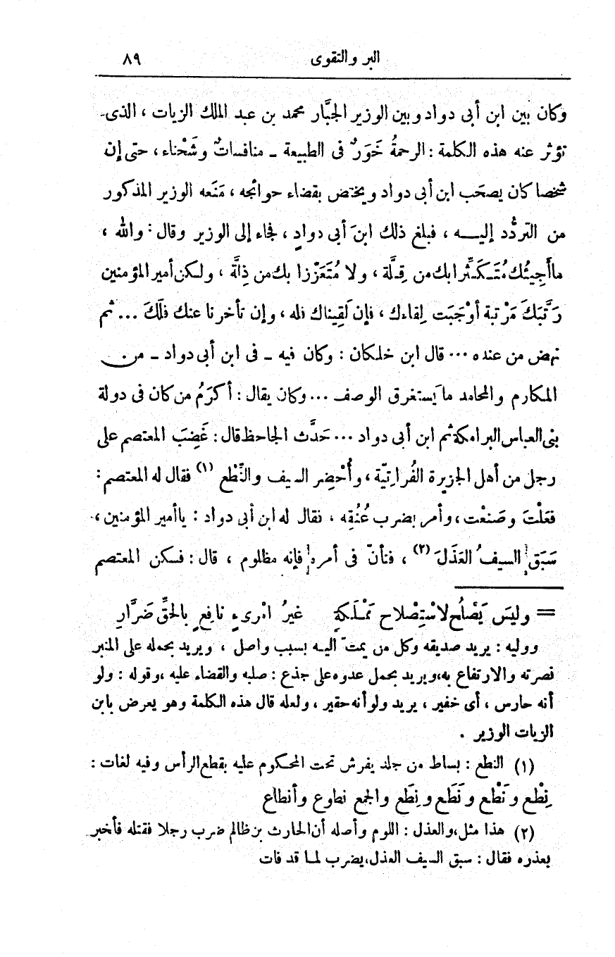 وكان بين ابن أبي دُواد وبين الوزير الجبّار محمد بن عبد الملك الزيات، الذي تؤثر عنه هذه الكلمة: الرَّحْمة خَوَرٌ في الطّبيعة - منافساتٌ وشحناء، حتى إن شخصاً كان يصحب ابن أبي دُواد ويختصُّ بقضاء حوائجه، منعَه الوزير المذكورُ من التردّد إليه، فبلغ ذلك ابن أبي دُوادٍ، فجاء إلى الوزير وقال: والله، ما أجيئك متكثّراً بِك من قلّة، ولا متعزّزاً بك من ذِلّة، ولكن أمير المؤمنين رتَّبك مرتبةً أوجبت لقاءَك، فإن لقيناك فلَه، وإن تأخّرنا عنك فلك. . . ثم نهض من عنده. . . قال ابن خلكان: وكان فيه - في ابن أبي دُواد - من المكارم والمحامد ما يستغرق الوصفَ. . . وكان يقال: أكرم من كان في دولةِ بني العباس البرامكةُ ثم ابن أبي دُواد. . . حدث الجاحظ قال: غضب المعتصم على رجلٍ من أهل الجزيرة الفراتية، وأُحضِر السيفُ والنطعُ فقال له المعتصم: