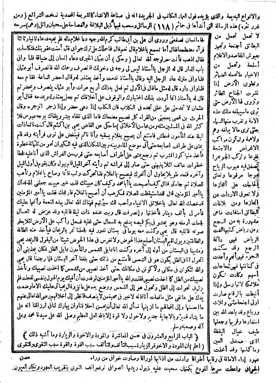 ومن غرر نثره هذه الرسالة التي أنشأها في حمائم الرسائل وسحب فيها ذيل البلاغة والفصاحة على سحبان وائل، وهي سرحة لا تحمل من البطائق أجنحة، وتجهز جيوش المقاصد والأقلام أسلحة، وتحمل من الأخبار ما تحمله الضمائر، وتطوير الأرض إذا نشرت الجناح الطائر، وتزوي لها الأرض حتى ترى ما سيبلغه ملك هذه الأمة، وتقرب منها السماء حتى ترى ما لا يبلغه وهم ولا همة، وتكون مراكب الأغراض والأجنحة قلوعا، وتركب الجو بحرا يصفق فيه هبوب الرياح موجاً مرفوعاً، وتعلق الحاجات على إعجازها، ولا تعوق الإرادات عن إنجازها ومن بلاغات البطائق استعادت ما هي مشهورة به من السجع، ومن رياض كتبها ألفت الرياض فهي دائمة الرجع، وقد سكنت النجوم فهي أنجم، وأعدت في كنانتها فهي للحاجات أسهم، وكادت تكون ملائكة لأنها رسل، وإذا أنيطت بالرقاع صارت أولي أجنحة مثنى وثلاث ورباع، وقد باعد الله بين أسفارها وقربها، وجعلها طيف خيال اليقظة الذي صدق العين وما كذبها، وقد أخذت عهود أداء الأمانة في رقابها أطواقا وأدت من أذنابها أورقاا، وصارت خوافي من وراء الخوافي، وأعطت سرها المودع بكتمان سحبت عليه ذيول ريشها الصوافي، ترغم أنف النوى بتقريب العهود، وتكاد العيون