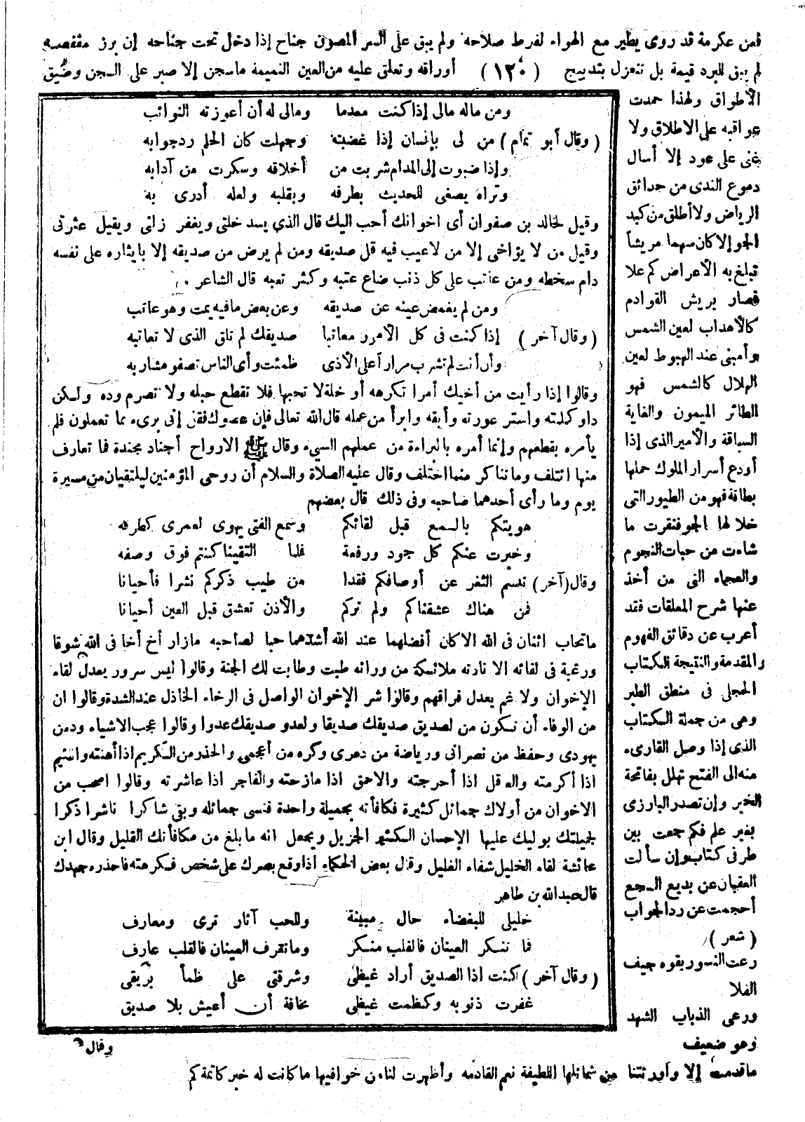 فعن عكرمة قد روي، يطير مع الهواء لفرط صلاحه ولم يبق على السر المصون جماح، إذا دخل تحت جناحه إن برز من مقصفه، لم يبق للبرد قيمة بل تنعزل بتدبيج أوراقه، وتعلق عليه من العين التميمة ما سجن إلا صبر على السجن وضيق الأطواق، ولهذا حمدت عواقبه على الإطلاق، ولا غنى على عود إلا أسال دموع الندى من حدائق الرياض، ولا أطلق من كبد الجو إلا كان سهما مريضا تبلغ به الأغراض، كما علا فصار بريش القوادم كالأهداب لعين الشمس، وأمسى عند الهبوط لعين الهلال كالشمس، فهو الطائر الميمون والغاية السباقة، والأمير الذي إذا أودع أسرار الملوك حملها بطاقة، فهو من الطيور التي خلا لها الجو فنقرت ما شاءت من حبات النجوم، والعجماء التي من أخذ عنها شرح المعلقات فقد أعرب عن دقائق الفهوم، والمقدمة والنتيجة الكتاب الحجلي في منطق الطير وهو من جملة الكتاب الذي إذا وصل القارىء منه إلى الفتح تهلل بفاتحة الخير، وإن تصدر البازي بغير علم فكم جمعت بين طرفي كتاب وإن سألت العقبان عن بديع السجع أحجمت عن رد الجواب.
