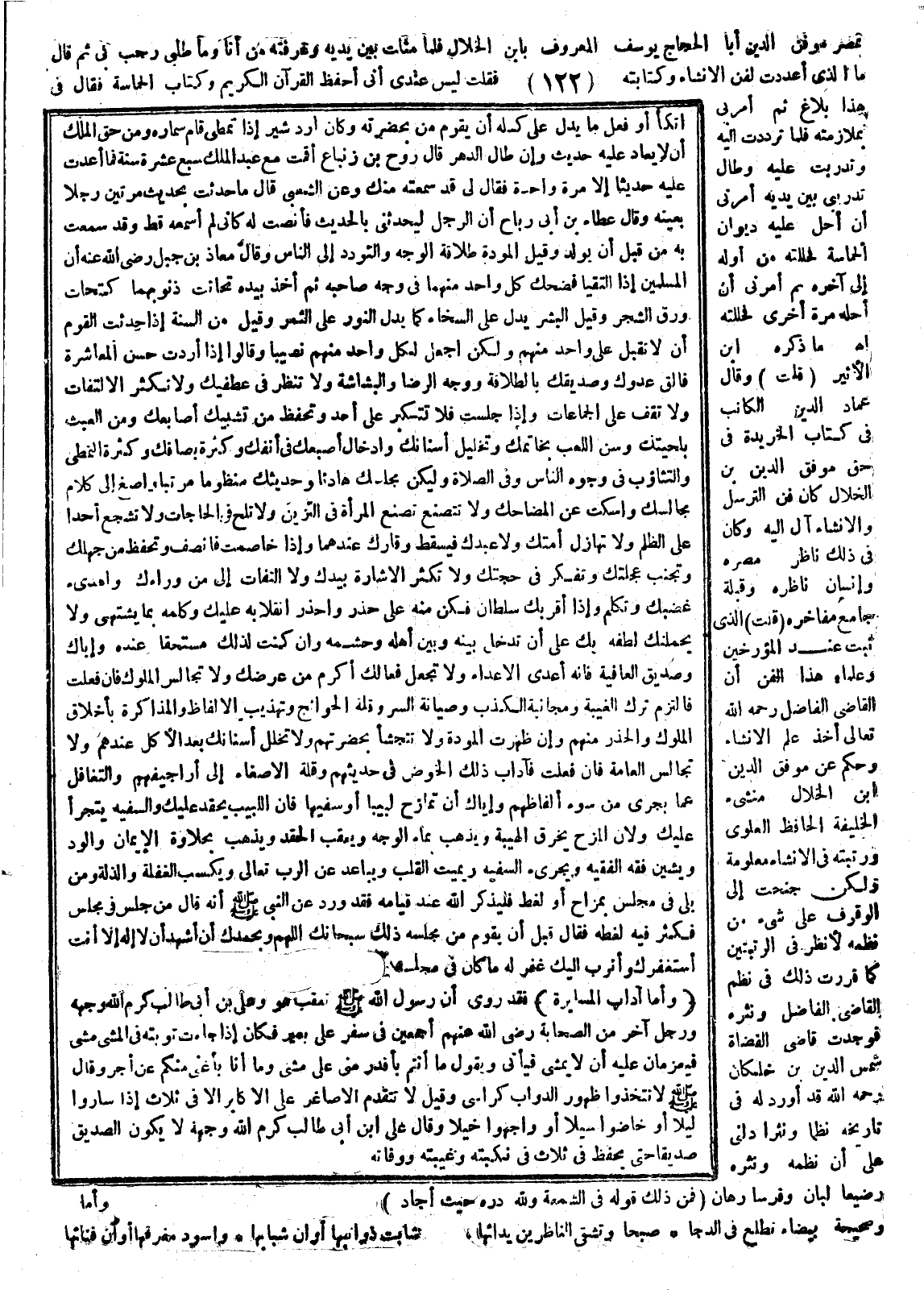 بمصر موفق الدين أبا الحجاج يوسف المعروف بابن الخلال فلما مثلت بين يديه وعرفته من أنا وما طلبي رحب بي ثم قال ما الذي أعددت لفن الانشاء وكتابته فقلت ليس عندي سوى أني احفظ القرآن الكريم وكتاب الحماسة فقال في هذا بلاغ ثم امرني بملازمته فلما ترددت إليه وتدربت عليه وطال تدريبي بين يديه أمرني أن أحل عليه ديوان الحماسة فحللته من أوله إلى آخره ثم أمرني أن أحله مرة أخرى فحللته انتهى ما ذكره ابن الأثير قلت وقال عماد الدين الكاتب في كتاب الخريدة في حق موفق الدين بن الخلال: كان فن الترسل والإنشاء آل إليه وكان في ذلك ناظر مصره وإنسان ناظره وقبلة جامع مفاخره قلت الذي ثبت عند المؤرخين وعلماء هذا الفن أن القاضي الفاضل رحمه الله تعالى أخذ علم الإنشاء وحكمه عن موفق الدين بن الخلال منشىء الخليفة الحافظ العلوي ورتبته في الإنشاء معلومة ولكن جنحت إلى الوقوف على شيء من نظمه لأنظر في الرتبتين كما قررت ذلك في نظم القاضي الفاضل ونثره فوجدت قاضي القضاة شمس الدين بن خلكان رحمه الله قد أورد له في تاريخه نظما ونثرا دلني على أن نظمه نثره رضيعا لبان وفرسا رهان. فمن ذلك قوله في الشمعة ولله دره حيث أجاد: