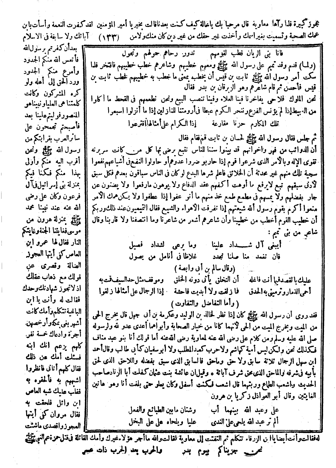 عجوز كبيرة فلما رآها معاوية قال مرحبا بك يا خالة كيف كنت بعدنا قالت بخير يا أمير المؤمنين لقد كفرت النعمة وأسأت بابن عمك الصحبة وتسميت بغير اسمك وأخذت غير حقك من غير دين كان منك ولا من آبائك ولا سابقة في الإسلام بعد أن كفرتم برسول الله فأتعس الله منكم الجدود وأمرغ منكم الخدود ورد الحق إلى أهله ولو كره المشركون، وكانت كلمتنا هي العليا ونبينا هو المنصور فوليتم علينا بعد فأصبحتم تجمحون على سائر العرب بقرابتكم من رسول الله صلى الله عليه وسلم ونحن أقرب إليه منكم وأولى بهذا منكم فكنا فيكم بمنزلة بين إسرائيل في آل فرعون وكان علي رضي الله عنه عند نبينا محمد صلى الله عليه وسلم بمنزلة هرون من موسى فغايتنا الجنة وغايتكم النار فقال لها عمرو ابن العاص: كفي أيتها العجوز الضالة واقصري عن قولك مع ذهاب عقلك إذ لا تجوز شهادتك وحدك فقالت له أنت يا ابن الباغية تتكلم وأمك كانت أشهر بغيٍ بمكة وأرخصهن أجرة وادعاك خمسة نفر كلهم يزعم أنك ابنه فسئلت أمك عن ذلك فقال كلهم أتاني فانظروا أشبههم به فألحقوه به فغلب عليك شبه العاص بن وائل فلحقت به، فقال مروان كفى أيتها العجوز واقصدي ما جئت له فقالت: وأنت أيضا يا ابن الزرقاء تتكلم ثم التفتت إلى معاوية فقالت والله ما أجرأ هؤلاء غيرك وأمك القائلة في قتل حمزة عم النبي صلى الله عليه وسلم: