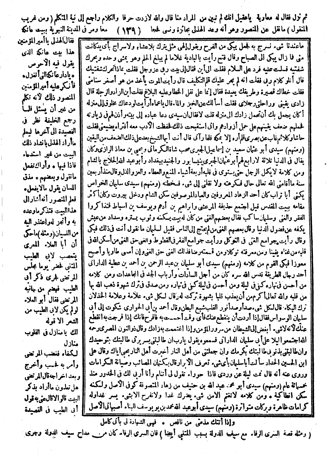 فأنكر عليه أمير المؤمنين المنصور ذلك لأنه تكلم من غير أن يسئل فلما رجع الخليفة نظر في القصيدة إلى آخرها ليعلم ما أراد الهذلي بإنشاد ذلك البيت من غير استدعاء فإذا فيها: