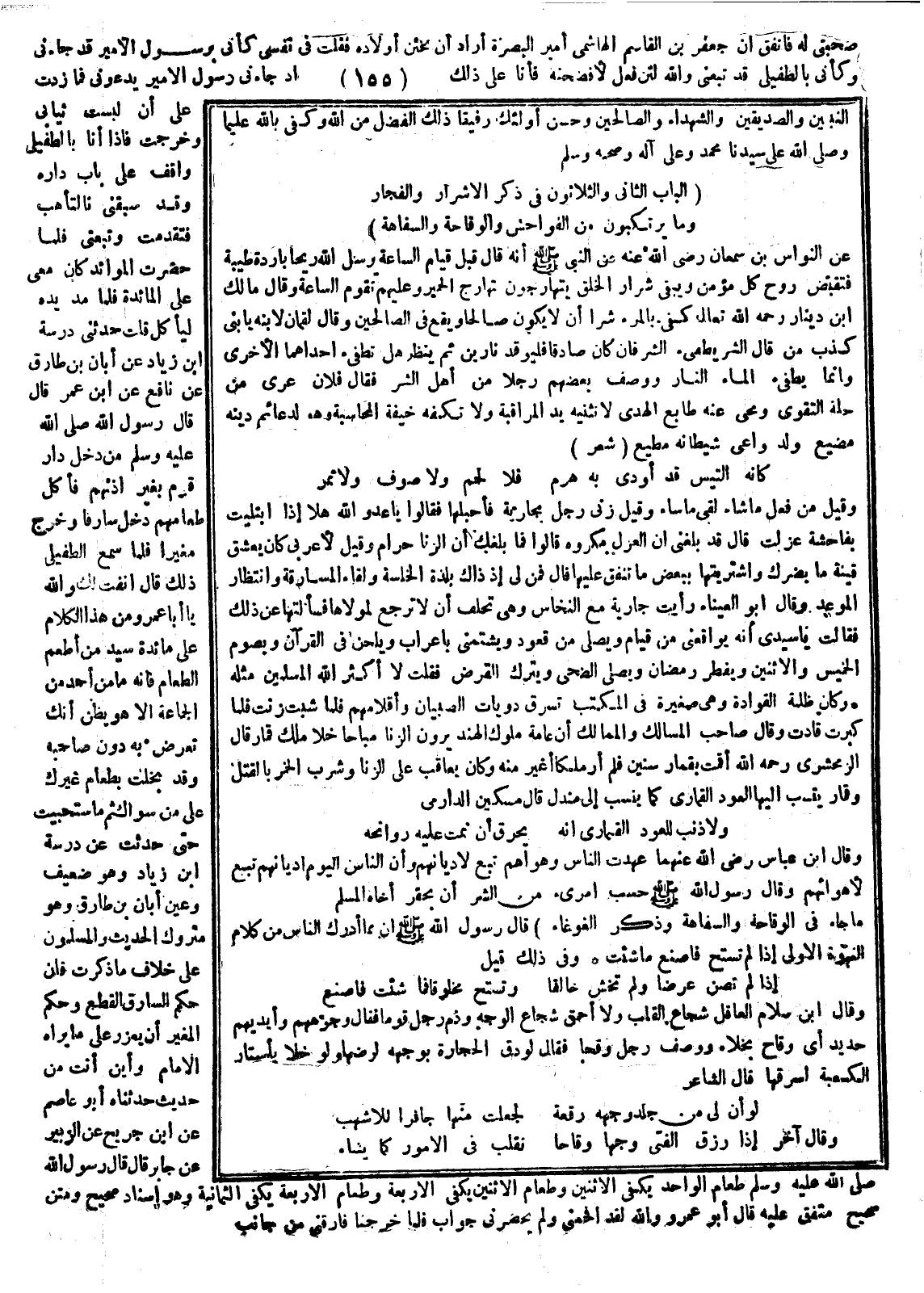 صحبتي له فاتفق أن جعفر بن القاسم الهاشمي أمير البصرة أراد أن يختن أولاده فقلت في نفسي كأني برسول الأمير قد جاءني وكأني بالطفيلي قد تبعني والله لئن فعل لأفضحنه فأنا على ذلك إذا جاءني رسول الأمير يدعوني فما زدت على أن لبست ثيابي وخرجت فإذا أنا بالطفيلي واقف على باب داره وقد سبقني بالتأهب فتقدمت وتبعني فلما حضرت الموائد كان معي على المائدة فلما مدَّ يده ليأكل قلت حدثني درسة بن زياد عن أبان ابن طارق عن نافع عن ابن عمر قال: قال رسول الله صلى الله عليه وسلم من دخل دار قوم بغير إذنهم فأكل طعامهم دخل سارقا وخرج مغيراً فلما سمع الطفيلي ذلك قال أنفت لك والله يا أبا عمرو من هذا الكلام على مائدة سيد من أطعم الطعام فإنه ما من أحد من الجماعة إلا وهو يظن أنك تعرض به دون صاحبه وقد بخلت بطعام غيرك على من سواك ثم ما استحييت حتى حدثت عن درسة بن زياد وهو ضعيف وعن أبان بن طارق وهو متروك الحديث والمسلمون على خلاف ما ذكرت فإن حكم السارق القطع وحكم المغير أن يعزر على ما يراه الإمام وأين أنت من حديث حدثنا أبو عاصم عن ابن جريج عن الزبير عن جابر قال: قال رسول الله صلى الله عليه وسلم طعام الواحد يكفي الأثنين وطعام الأثنين يكفي الأربعة وطعام الأربعة يكفي الثمانية وهو إسناد صحيح ومتن صحيح متفق عليه قال أبو عمرو والله لقد أفحمني ولم يحضرني جواب فلما خرجنا فارقني من جانب