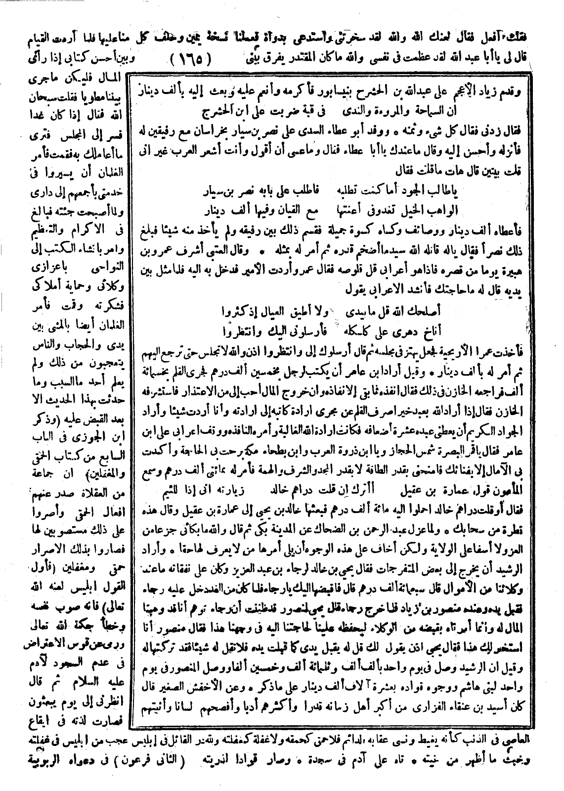 فقلت أفعل فقال: لعنك الله والله لقد سحرتني واستدعى بدواة فعملنا نسخة يمين وحلف كل منا عليها فلما أردت القيام قال لي يا أباع عبد الله لقد عظمت في نفسي والله ما كان المقتدر يفرق بيني وبين أحسن كتابي إذا رأى المال فليكن ما جرى بيننا مطويا فقلت سبحان الله فقال إذا كان غدا فسر إلى المجلس فترى ما أعاملك به فقمت فأمر الغلمان أن يسيروا في خدمتي بأجمعهم إلى داري ولما أصبحت جئته فبالغ في الإكرام والتعظيم وأمر بانشاء الكتب إلى النواحي بإعزاز وكلائي وحماية أملاكي فشكرته وقمت فأمر الغلمان أيضا بالمشي بين يدي والحجاب والناس يتعجبون من ذلك ولم يعلم أحد ما السبب وما حدثت بهذا الحديث إلا بعد القبض عليه.