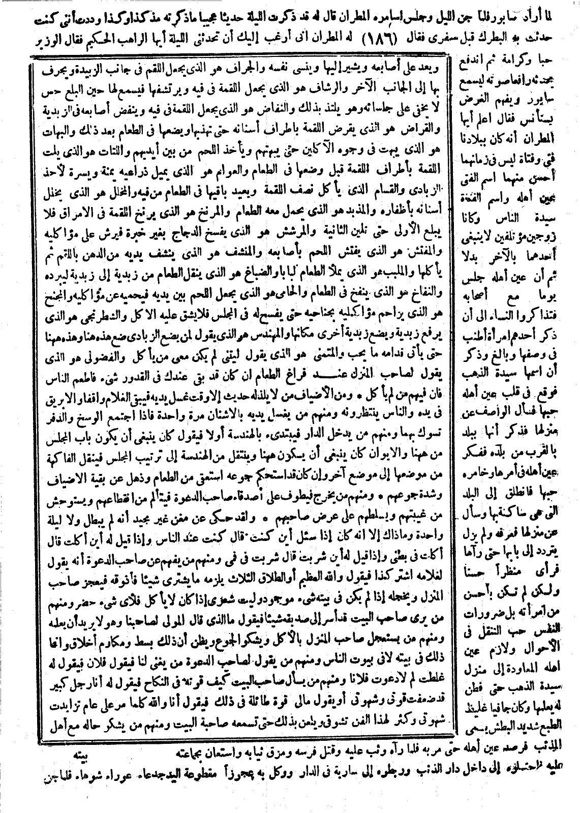 لما أراد سابور فلما جنَّ الليل وجلس لمسامرة المطران قال له ذكرت الليلة حديثا عجيبا ما ذكرته منذ كذا وكذا وددت أنني كنت حدثت به البطرك قبل سفري فقال له المطران إني أرغب إليك أن تحدثني الليلة أيها الراهب الحكيم فقال الوزير حبا وكرامة ثم اندفع يحدثه رافعا صوته ليسمع سابور ويفهم الغرض ويستأنس فقال اعلم أيها المطران أنه كان ببلادنا فتى وفتاة ليس في زمانهما أحسن منهما اسم الفتى عين أهله واسم الفتاة سيدة الناس وكانا زوجين مؤتلفين ولا يبتغي أحدهما بالآخر بدلا ثم أن عين أهله جلس يوما مع أصحابه فتذاكروا النساء إلى أن ذكر أحدهم امرأة أطنب في وصفها وبالغ، وذكر أن اسمها سيدة الذهب فوقع في قلب عين أهله حبها فسأل الواصف عن منزلها فذكر أنها ببلد بالقرب من بلده ففكر عين أهله في أمرها وخامره حبها فانطلق إلى البلد التي هي ساكنة بها وسأل عن منزلها فعرفه ولم يزل يتردد إلى بابها حتى رآها فرأى منظرا حسناً ولكن لم تكن بأحسن من امرأته بل ضرورات النفس حب التنقل في الأحوال ولازم عين أهله المعاودة إلى منزل سيدة الذهب حتى فطن له بعلها وكان جافيا غليظ الطبع شديد البطش يسمى الذئب فرصد عين أهله حتى مر به فلما رآه وثب عليه وقتل فرسه ومزق ثيابه واستعان بجماعته عليه فاحتملوه إلى داخل دار الذئب وربطوه إلى سارية في الدار ووكل به عجوزاً مقطوعة اليد جدعاء عوراء شوهاء فلما جن