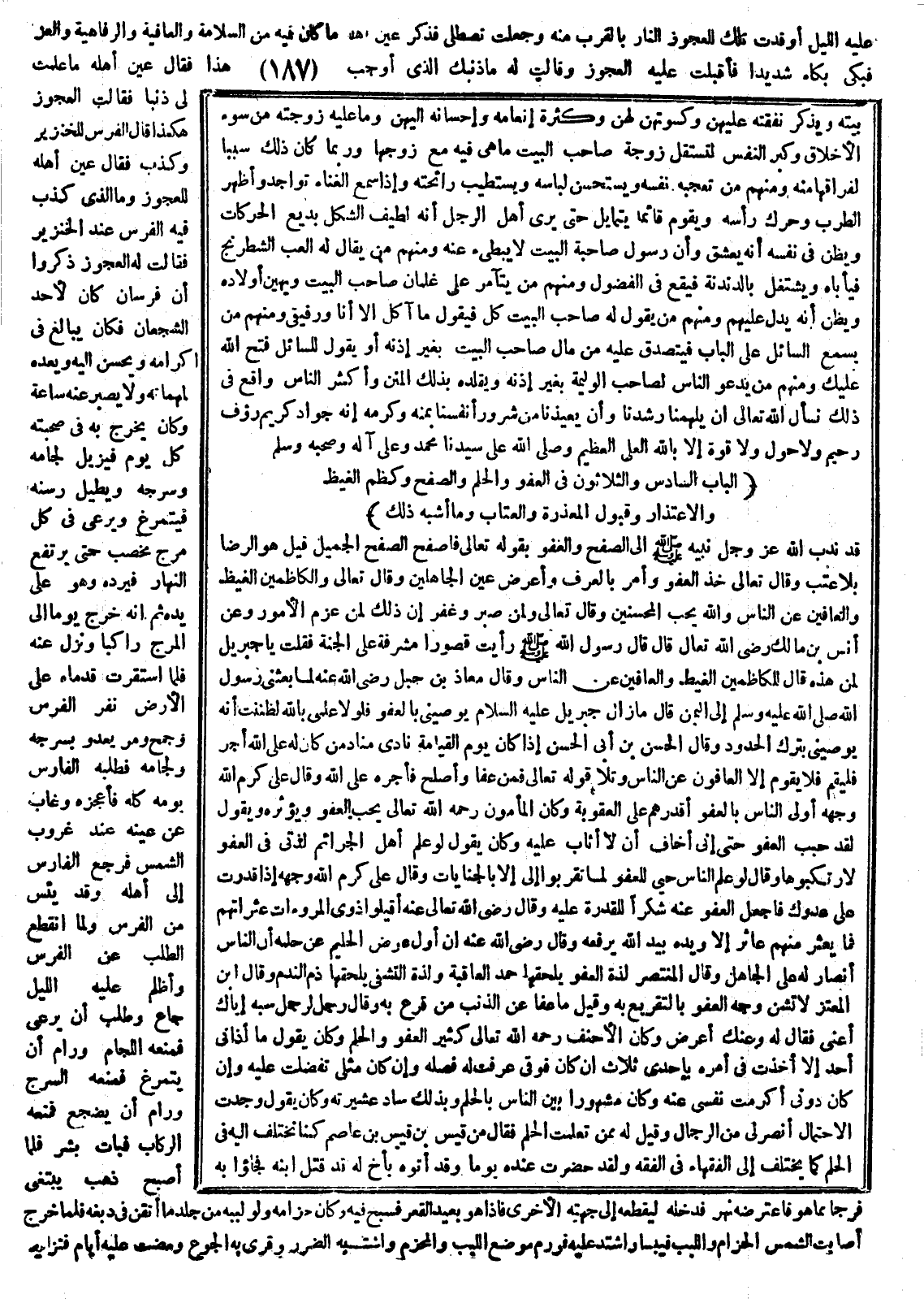 إليه ويعده لمهماته ولا يصبر عنه ساعة وكان يخرج به في صحبته كل يوم فيزيل لجامعه وسرجه ويطيل رسنه فيتمرغ ويرعى في كل مرج مخصب حتى يرتفع النهار فيرده وهو على يده ثم أنه خرج يوماً إلى المرج راكباً ونزل عنه فلما استقرت قدماه على الأرض نفر الفرس وجمح ومر يعدو بسرجه ولجامه فطلبه الفارس يومه كله فأعجزه وغاب عن عينه عند غروب الشمس فرجع الفارس إلى أهله وقد يئس من الفرس ولما انقطع الطلب عن الفرس وأظلم عليه الليل جاع وطلب أن يرعى فمنعه اللجام ورام أن يتمرغ فمنعه السرج ورام أن يضطجع فمنعه الركاب فبات بشر فلما أصبح ذهب يبتغي فرجا مما هو فيه فاعترضه نهر فدخله ليقطعه إلى جهته الأخرى فإذا هو بعيد القعر فسبح فيه كان حزامه ولببه من جلد ما اتقن في دبغه فلما خرج أصابت الشمس الحزام واللبب فيبسا واشتد عليه فورم موضع اللبب والمحزم واشتد به الضرر وقوي به الجوع ومضت عليه أيام فتزايد