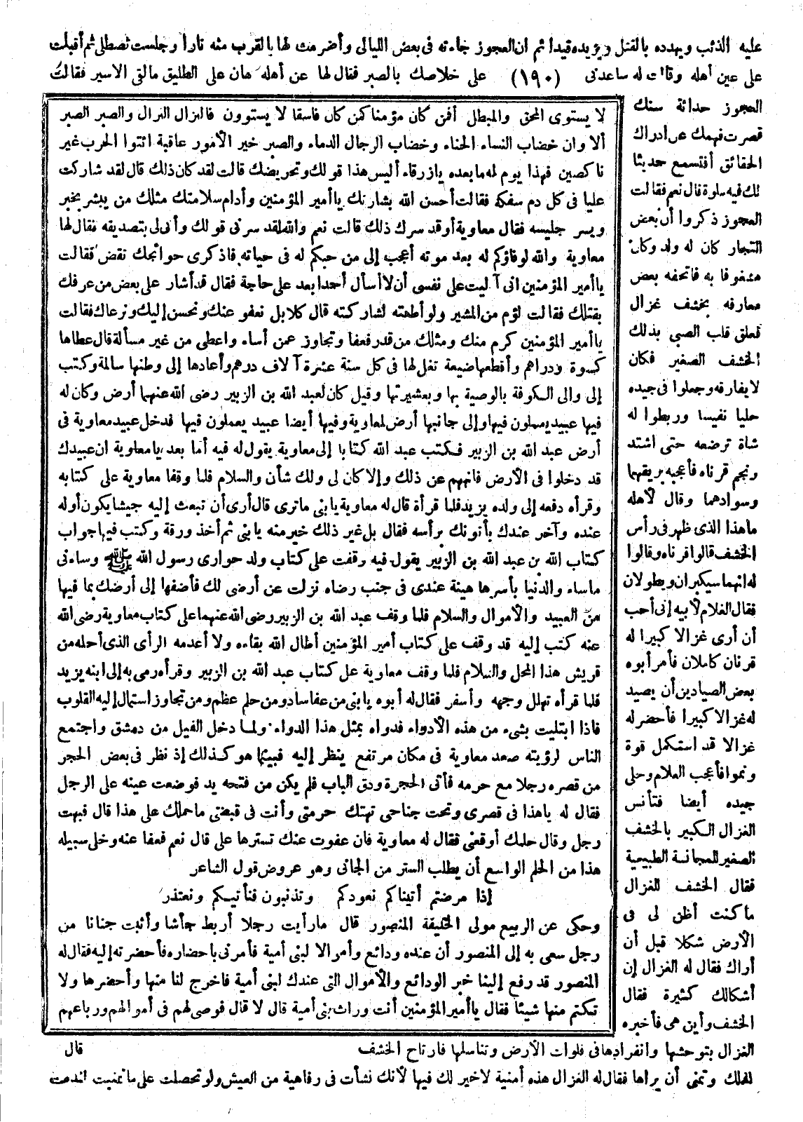 عليه الذئب ويهدده بالقتل ويزيده قيداً ثم إن العجوز جاءته في بعض الليالي وأضرمت لها بالقرب منه ناراً وجلست تصطلي ثم أقبلت على عين أهله وقالت له ساعدني على خلاصك بالصبر فقال لها عين أهله وهان على الطليق ما لقي الأسير فقالت العجوز حداثة سنك قصرت فهمك عن إدراك الحقائق أفتسمع حديثاً لك فيه سلوة قال نعم فقالت العجوز ذكروا أن بعض التجار كان له ولد وكان مشغوفا به فأتحفه بعض معارفه بخشف غزال فعلق قلب الصبي بذلك الخشف الصغير فكان لا يفارقه وجعلوا في جيده حليا نفيساً وربطوا له شاة ترضعه حتى